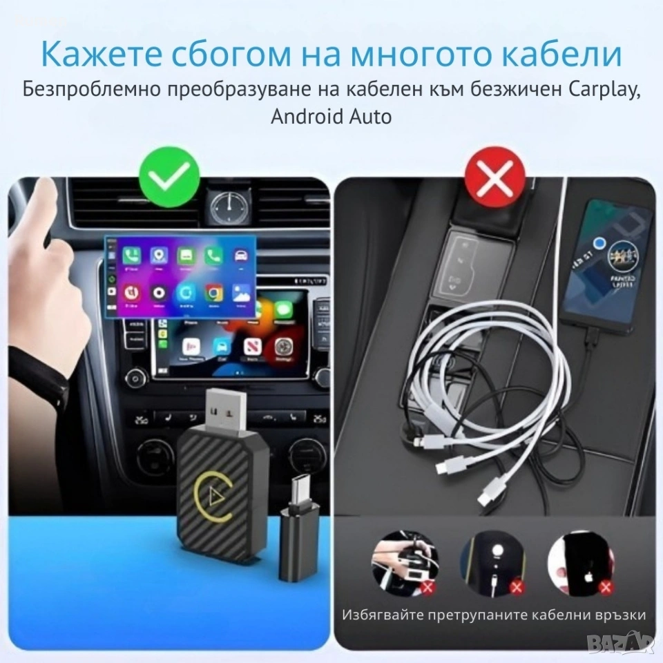 Безжичен адаптер за CarPlay и Android Auto – Plug & Play, Bluetooth 5.0, двулентов Wi-Fi 2.4/5GHz → Обява 53238744