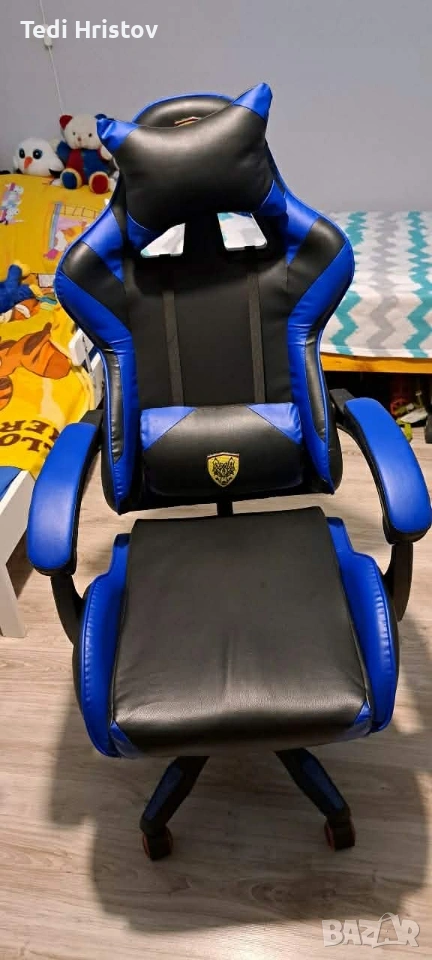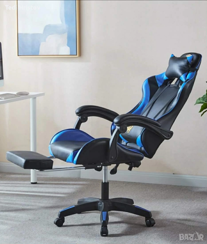 Геймърски стол за релакс с масаж и подложка за крака – син → Обява 53239166