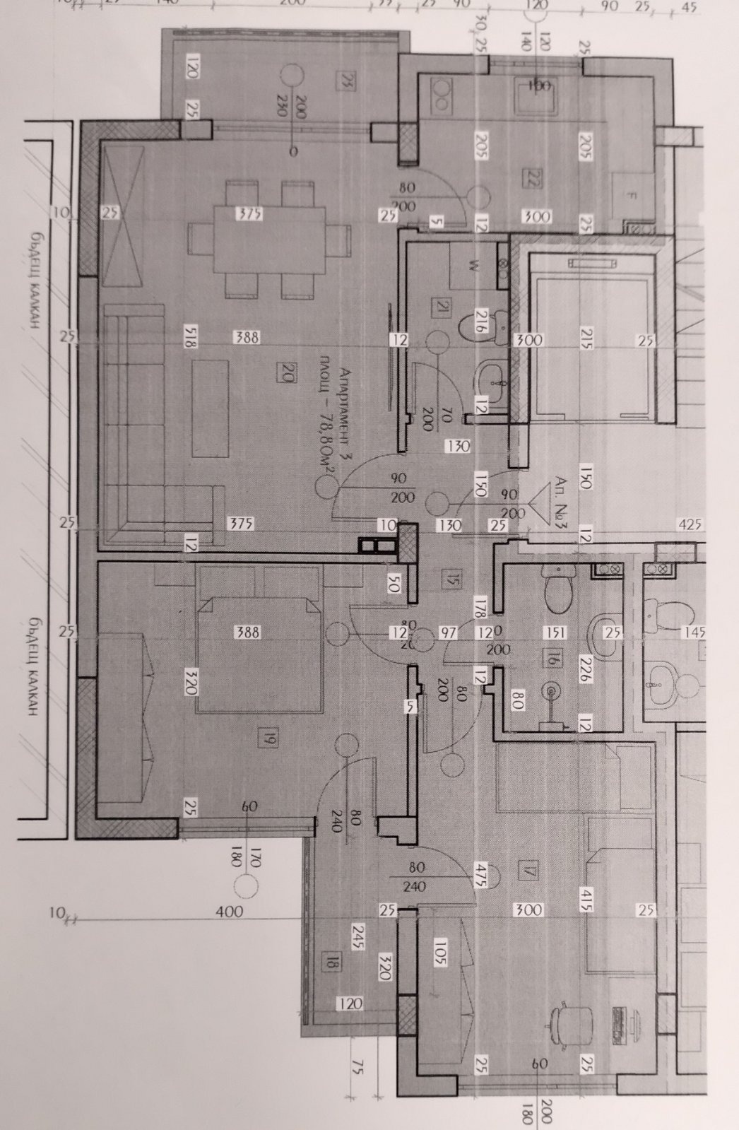 Сердика 1 предлага на вашето внимание нов проект на доказала се във времето строителна фирма, находящ се в спокоен и добре уреден квартал в Благоевград / ниската част на Баларбаши/. Архитектурата на сградата е модерна и съчетава в себе си комбинация от традиционни материали, метал и мазилка по фасадите. Сградата е проектирана с луксозни общи части, зелени пространства и топла връзка между сутерена и подземните паркоместа. Предвидени са четири жилищни етажа с общо 13 броя апартамента. Строителството ще бъде изпълнено с висок клас материали. Общи технически параметри на сградата: конструкцията е монолитен стоманобетонен скелет с керамична тухлена зидария 25 см за външните зидарии и 12 см за вътрешните преградни стени; фасада е комбинация от метал и силиконова мазилка Баумит; топлоизолация 10 см с коефициент 0,031 W/mK; дограмата 7 камерна ПВЦ дограма с троен стъклопакет; покрив по архитектурен детайл - XPS 10 см и замазка за наклон; два пласта хидроизолация 4 мм; луксозни входни врати: блиндирани с многоточково заключване и касова брава; стените и тавани са с машинно-гипсова мазилка; пода е машинна цименто-пясъчна замазка с машинно шлайфане с максимална дебелина до 5 см; луксозно изпълнени общи части с под гранит и латекс по стените, парапет инокс, скрито осветление и декоративни елементи и панели; слаботокови инсталации, домофони и видеонаблюдение. Имотът е част от модерно тухлено строителство и в момента е на груб строеж. Сградата ще бъде завършена в края на 2027 година. Общата площ на апартамента е 88.80 кв. и е със следното разпределение - две светли спални с излаз на обща тераса; голям хол с трапезария с излаз на тераса; малък кухненски бокс; баня с тоалетна; тоалетна; коридор.
