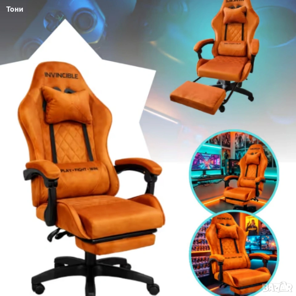 Оранжев велурен геймърски стол с поставка за крака – ергономичен, метална рамка → Обява 53239996