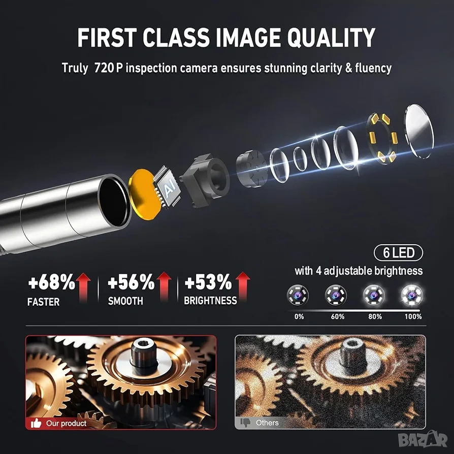 * Висококачествена оптика: Камера с диаметър едва 6.2 мм и резолюция 1280x720P (HD), снабдена с 6 регулируеми LED светлини за отлична видимост в тъмни пространства.