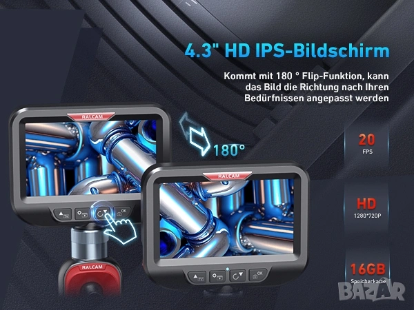 Професионален Ендоскоп Ralcam 360° с 4.3" IPS Екран и 6.2mm Сонда