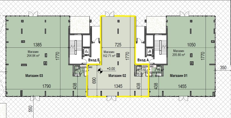 15 % ПЪРВОНАЧАЛНА ВНОСКА за сграда с Акт 14, остатъка преди Акт 16! Компания Юнивърсъл с дългогодишен опит на имотния пазар представя многофункционален имот със статут на магазин /М02/. Добра инвестиционна възвращаемост в района. Средния наем за търговски площи е от 10 до 14 Евро за 1 кв. метър. Помещението е с отлична видимост и големи витрини. ПОДХОДЯЩ е ЗА: банков офис, магазин, медицински център, лаборатория, шоу рум, обучителен център, козметично или соларно студио, фризьорски салон, аптека, фитнес център и др. Локация: Имотът се намира в модерен жилищен комплекс с богато озеленено пространство, между две метростанции Театрална и Хаджи Димитър . Районът е в близост до бул. Ботевградско шосе , с изградена инфраструктора и голям пътникопоток, бърз и лесен достъп до централната градска част. Осигурени места за паркиране. Разпределение: Застроена площ на магазина 171 кв. метра Разположен е на партер. Има санитарно помещение, склад и по два вход/изхода, вентилационна система и отопление на ток. Възможност за обединяване със съседните помещения и да се получи търговска площ до 670 кв. метра Предава се на шпакловка и замазка и ВиК. Осигурено кредитиране на Акт обр. 15. Схема на плащане -15% предв. договор,-80% след Акт 15 и 5% след Акт 16