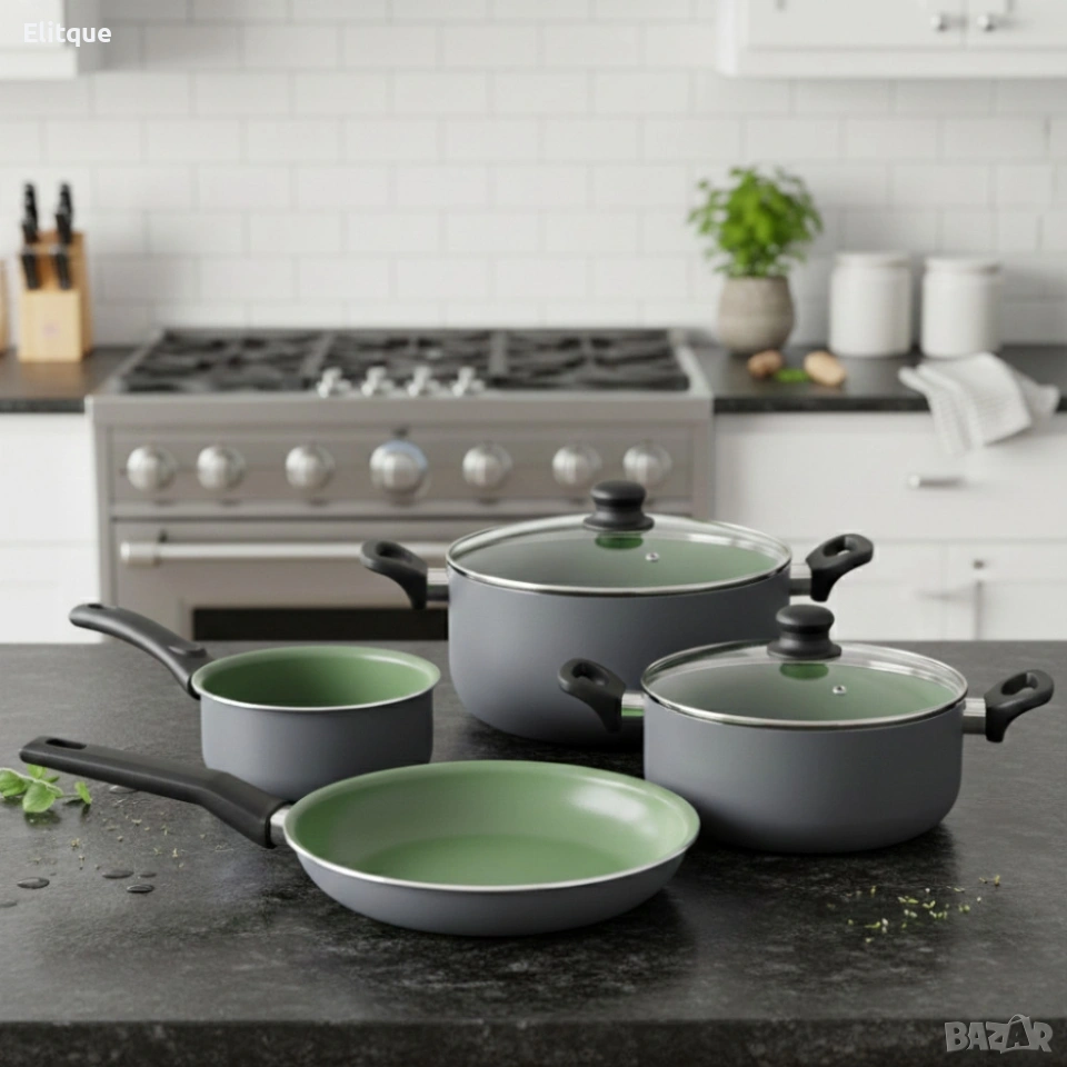 Материал: Алуминий; Размери: Касерола: 16 см; Тенджера: 20 см; Тенджера: 24 см; Тиган: 24 см; Покритие: Незалепващо Pfluon; Цвят: Сиво и зелено; Поддръжка: Лесно почистване, съвместим със съдомиялна машина; Капак: Стъклен с отвор за пара; Съвместимост: Подходящи за всички видове котлони, включително индукционни.