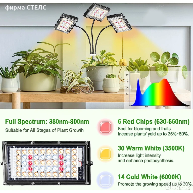 Пълен спектър: Специална конфигурация от 150 диода за ускорен растеж и цъфтеж.