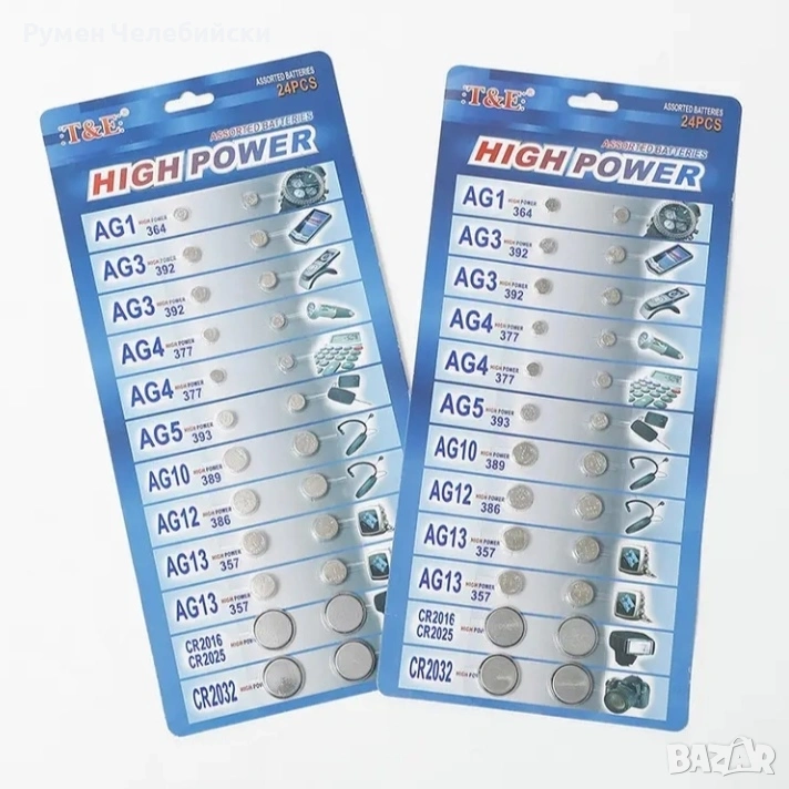 24 бр. Високомощни Супер Алкални Батерии с Кръгла Форма (1 Карта по 24 броя) - Дълготрайни 1.5V AG3/LR41/AG4/LR626/AG5/LR754/AG10/LR1130/AG13/LR44/AG1/AG12/CR2016/CR2025/CR2032 - Съвместими със Часовници, Аудио Апарати за Подобряване на Слуха, Дистанционно Управление,