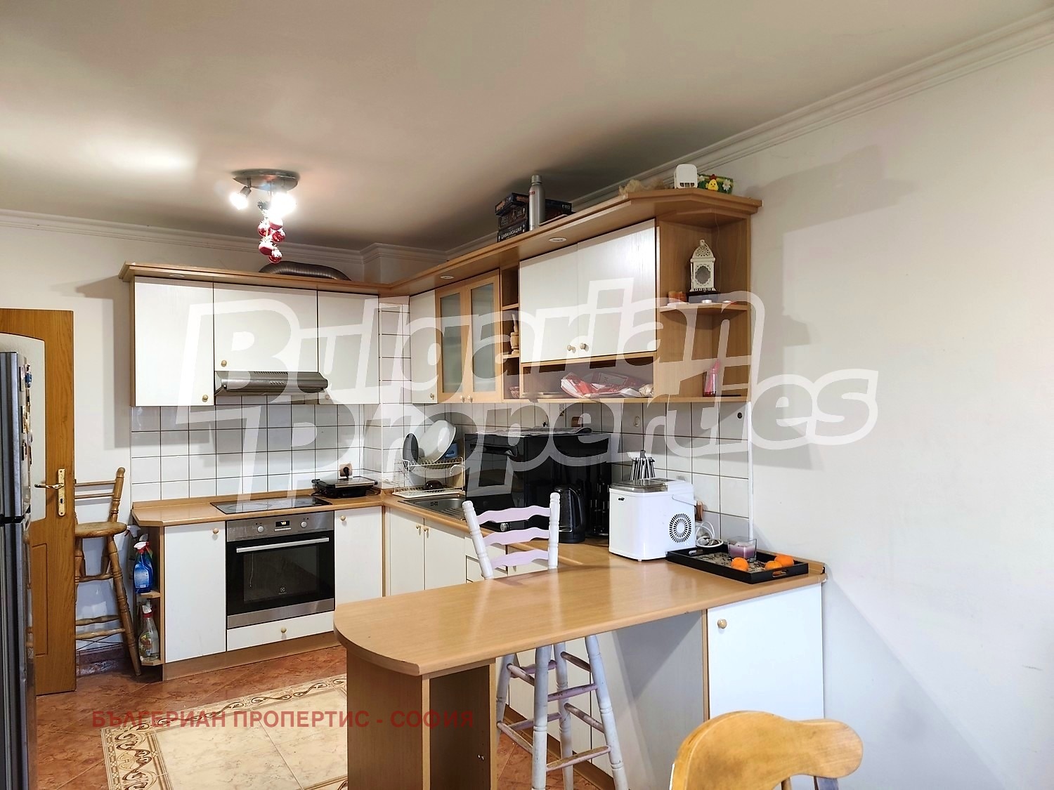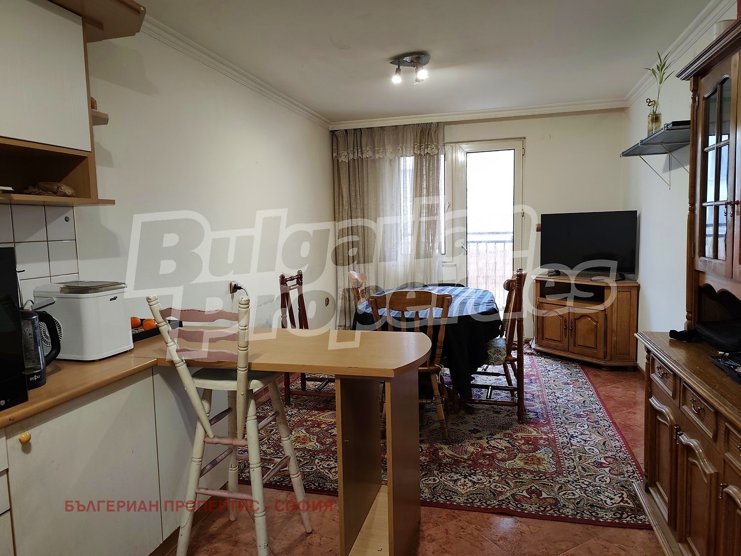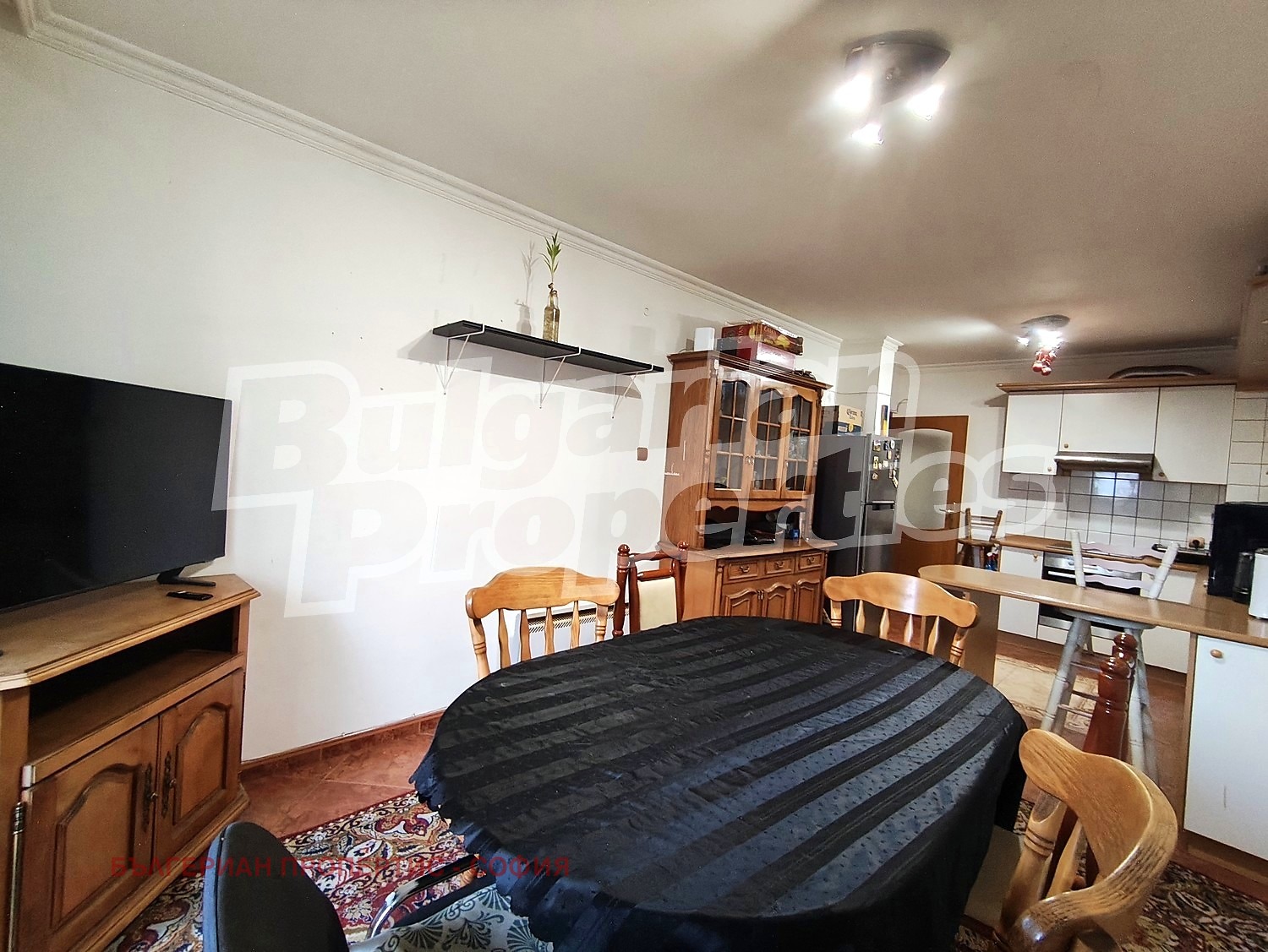 Интериорът е изпълнен с внимание към детайла и висококачествени материали. Всекидневната разполага с комфортна холна гарнитура и трапезария от масивен дъб, изработена по поръчка. Кухнята е напълно оборудвана с кухненски шкафове, хладилник, пералня, вградена електрическа фурна и телевизор. Жилището разполага с две луксозно обзаведени спални, създаващи уютна и спокойна атмосфера.