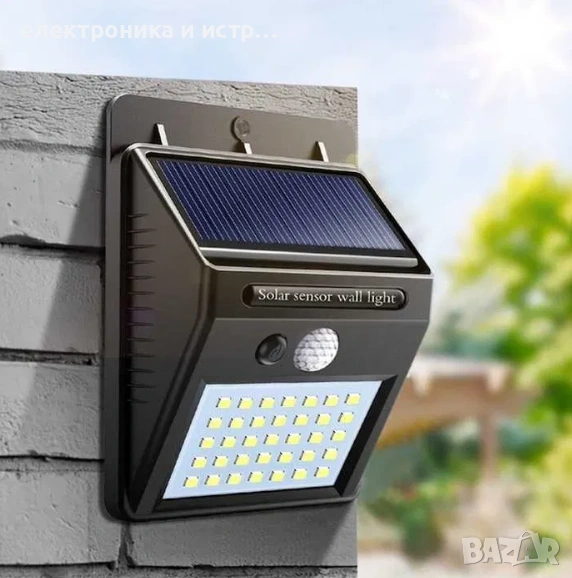Осветителните тела със соларно захранване стават все по-предпочитан начин за осветяване на двора и градината. Решението за това е външна лампа със соларен панел и датчик за движение. Моделът е с водоустойчива конструкция и трябва само да се монтира на слъчево място, за да може соларния панел да се зареди. Датчика за движение се активира, само след като установи движение и след около 10 секуди се изключва автоматично.
