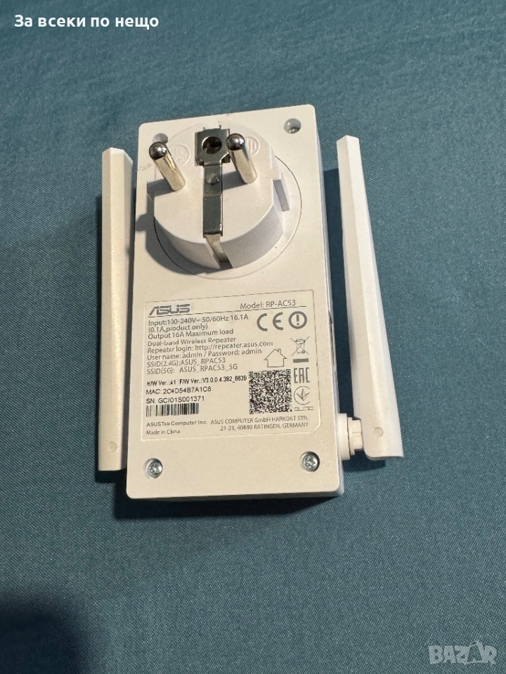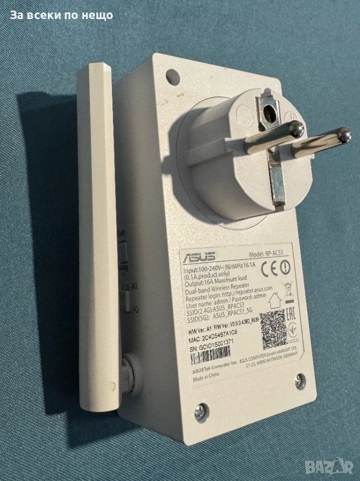 Безжичен Range Extender ASUS RP-AC53,AC750 wall-plug, Двубандов , номер: ASUS-RP-AC53 2 антени Wi-FI