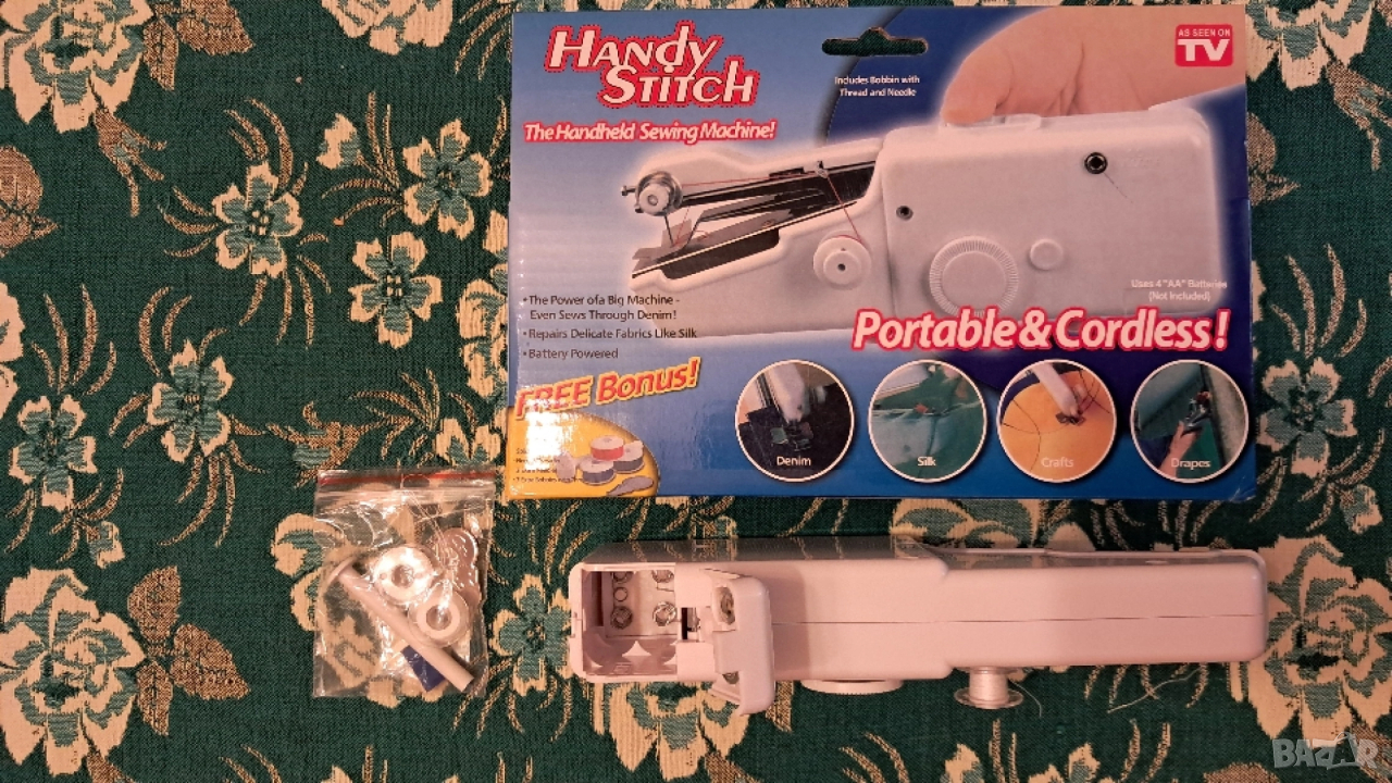 Чисто нова мини шевна машина.Използва 4 батерии АА.В комплекта има резервни макари с конец и игли.