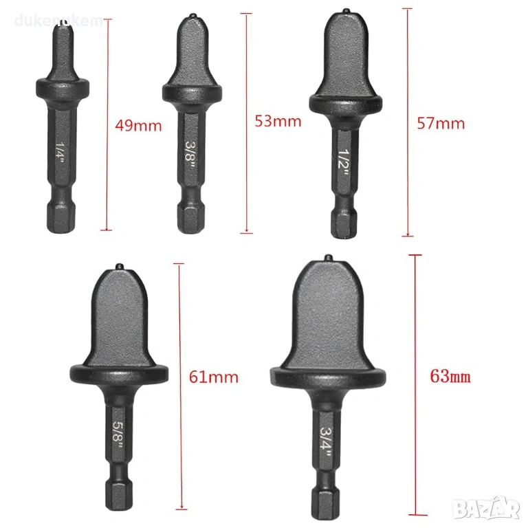 Размери: 1/4" (6.35 мм), 1/2" (12.7 мм), 5/8" (15.9 мм), 3/4" (19 мм)