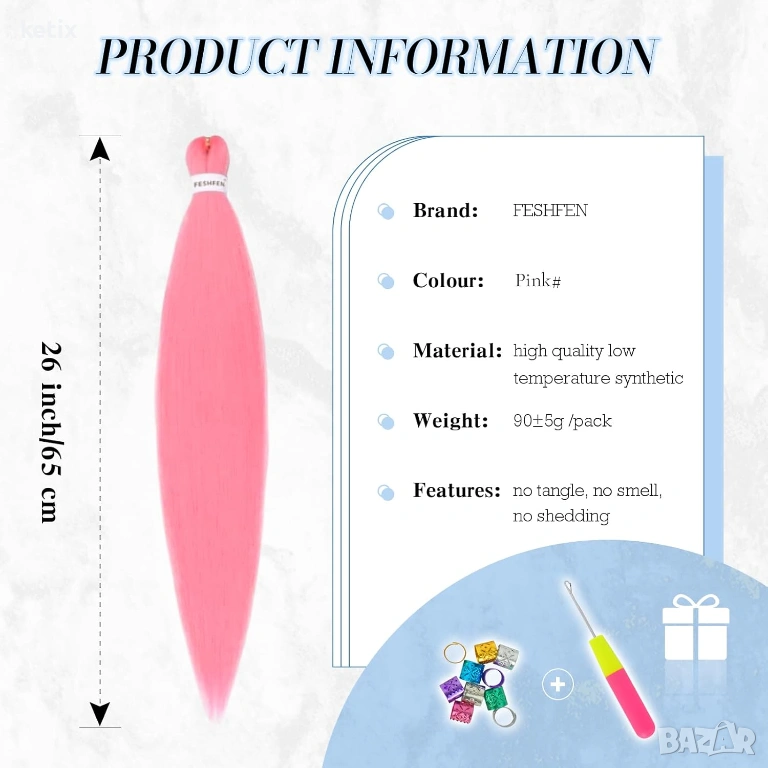 Материал: предварително опънатата коса за плетене е изработена от студоустойчиви синтетични влакна. Текстурата е естествено изглеждаща и мека на допир, точно като човешка коса.