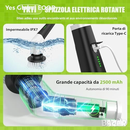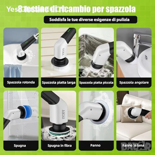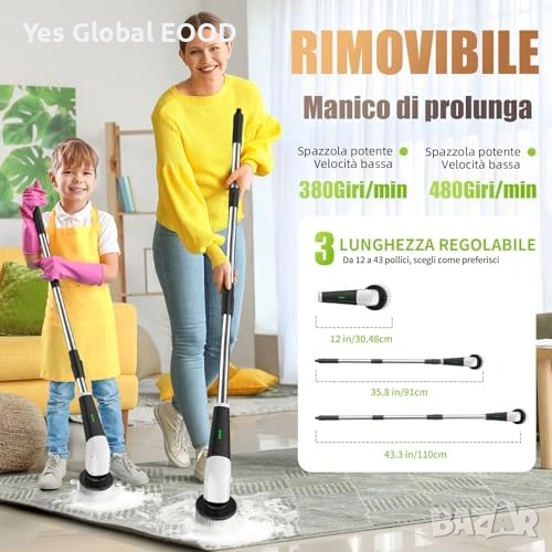 YKYI електрическата ротационна четка е практично решение за ефективно почистване на баня, кухня, подове и труднодостъпни места. Уредът разполага с 8 сменяеми накрайника и телескопична дръжка с регулируема дължина от 30 до 110 см, което позволява удобно почистване без навеждане. Двете скорости на въртене осигуряват гъвкавост според типа замърсяване, а вградената батерия с капацитет 2500 mAh гарантира дълга автономна работа.