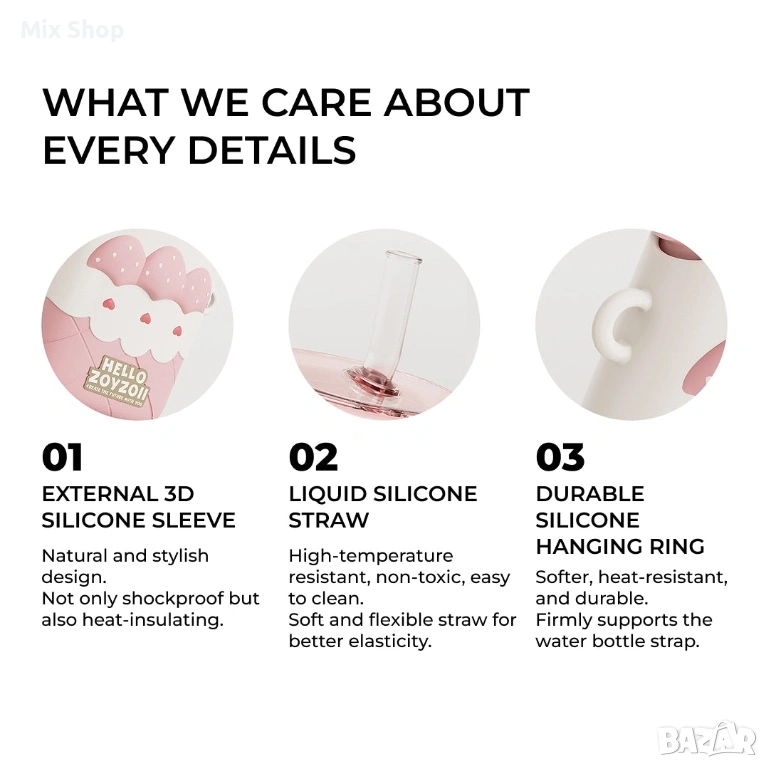 Силикон, подходящ за храна: Изработена от нетоксичен силикон, подходящ за храна, осигуряващ безопасни и екологични решения за пиене за деца.