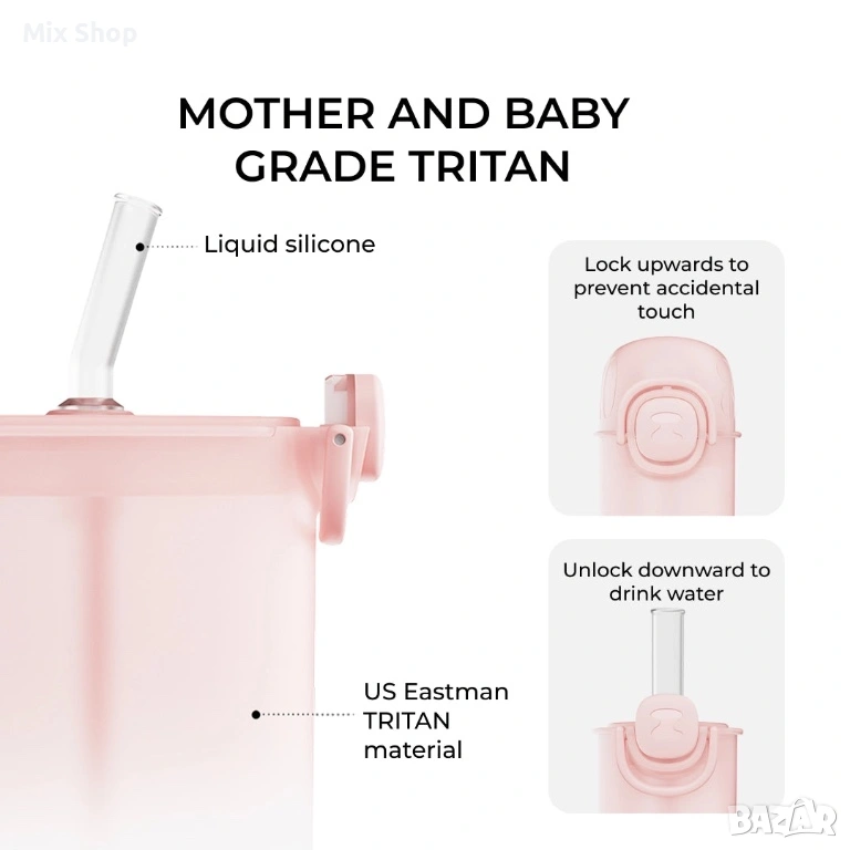 Тритан, подходящ за майката и бебето: Чашката е изработена от тритан, подходящ за майката и бебето, известен със своята здравословна и безопасна здравословна издръжливост. Тританът е устойчив на топлина и не отделя никакви вредни вещества, осигурявайки безопасна основа за ежедневна употреба.