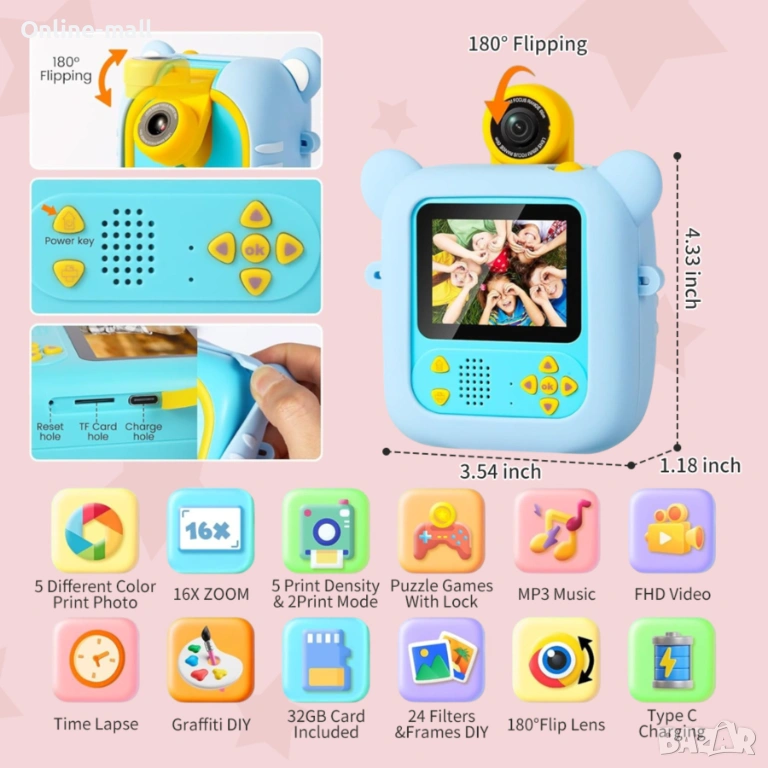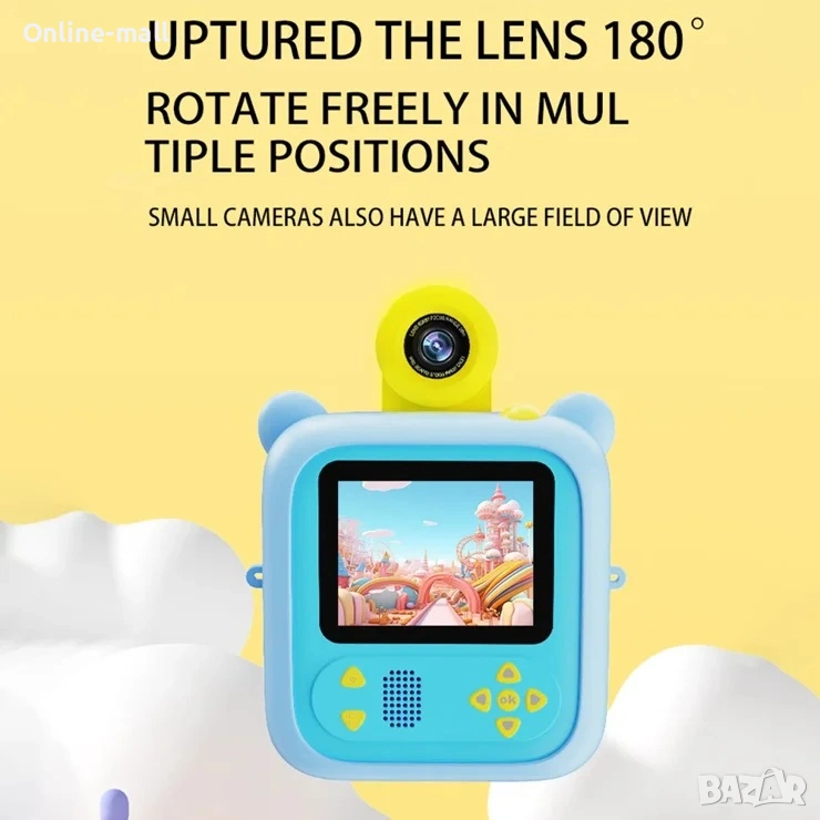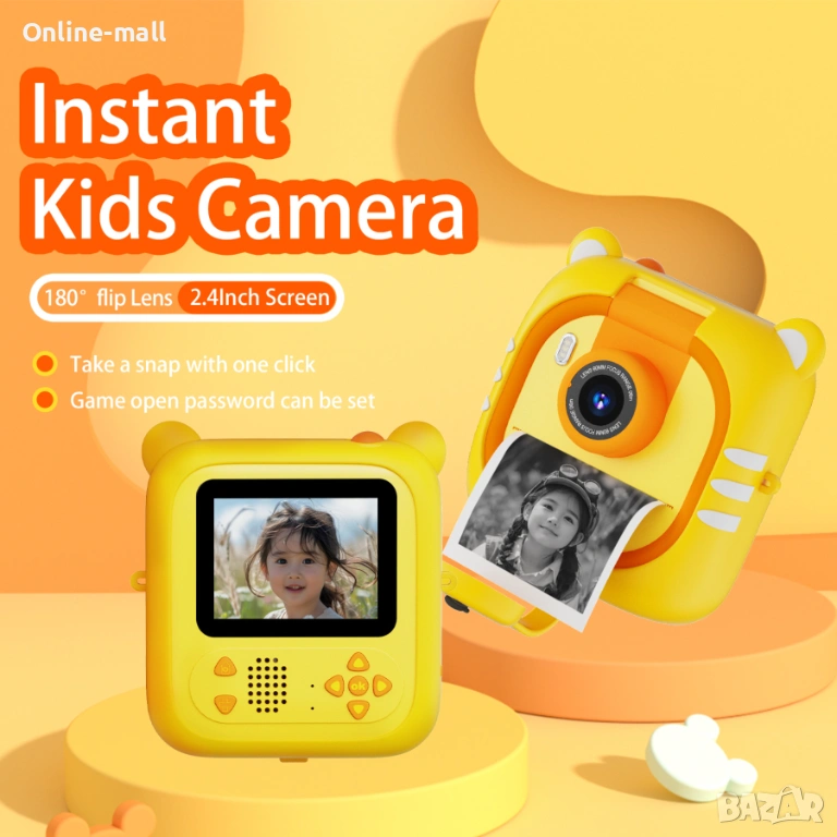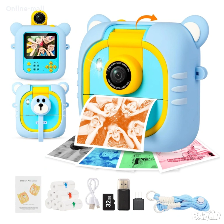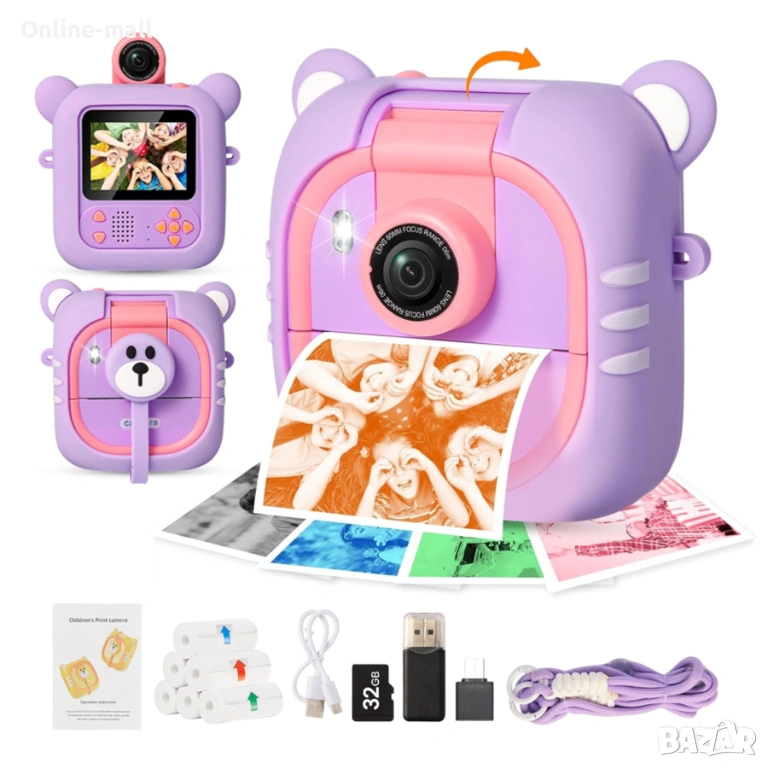 Интерактивна детска камера с моментален печат, 180° flip камера, игри и образователни функции. Създадена специално за деца – здрава, лесна за употреба и без нужда от мастило.