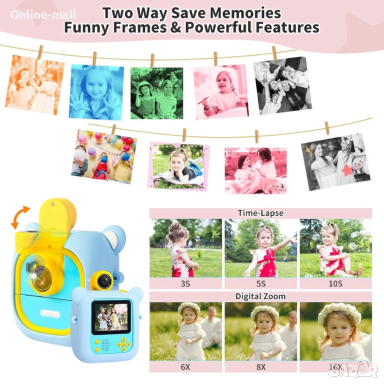 Тази детска instant камера комбинира снимане, видео, игри и моментален термо печат, за да превърне всяко детско преживяване в истински спомен. Благодарение на 180° въртящия се обектив, камерата може да се използва както за селфита, така и за стандартни снимки и видеа.