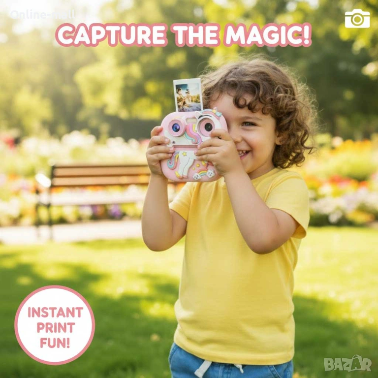 Камерата е създадена специално за детски ръце – компактна, лека и с мек силиконов калъф, който предпазва при изпускане. Управлението е интуитивно, а дизайнът с еднорог превръща снимането в истинско приключение. Отпечатаните снимки могат да се оцветяват, лепят в тетрадки или да се запазят като спомен.
