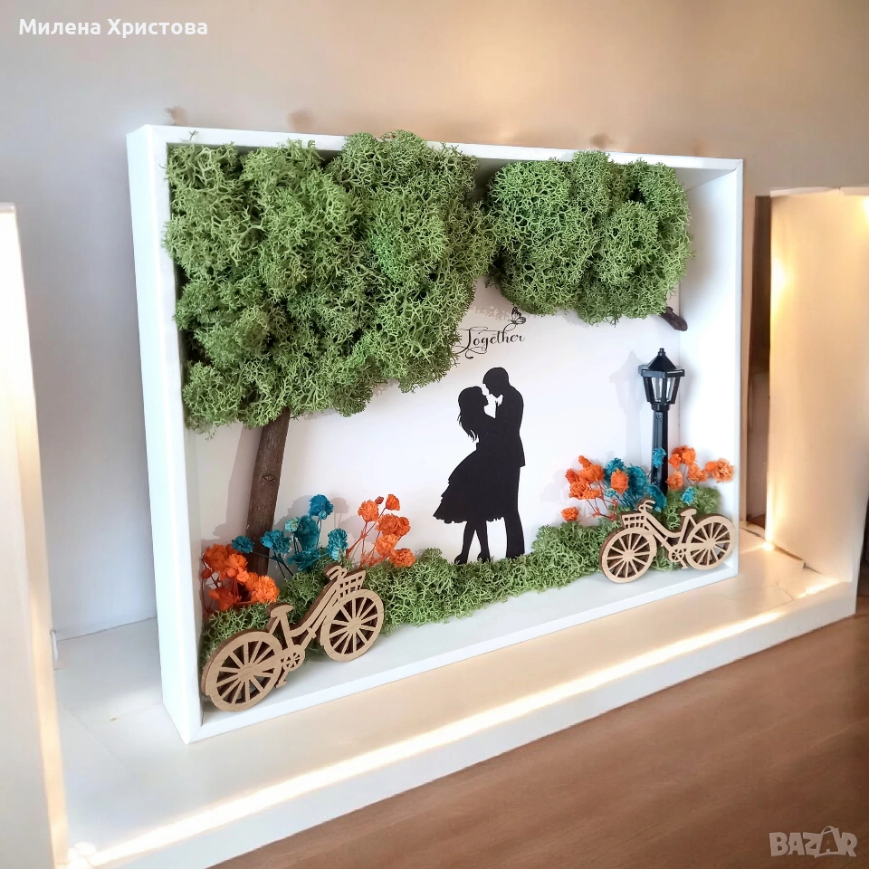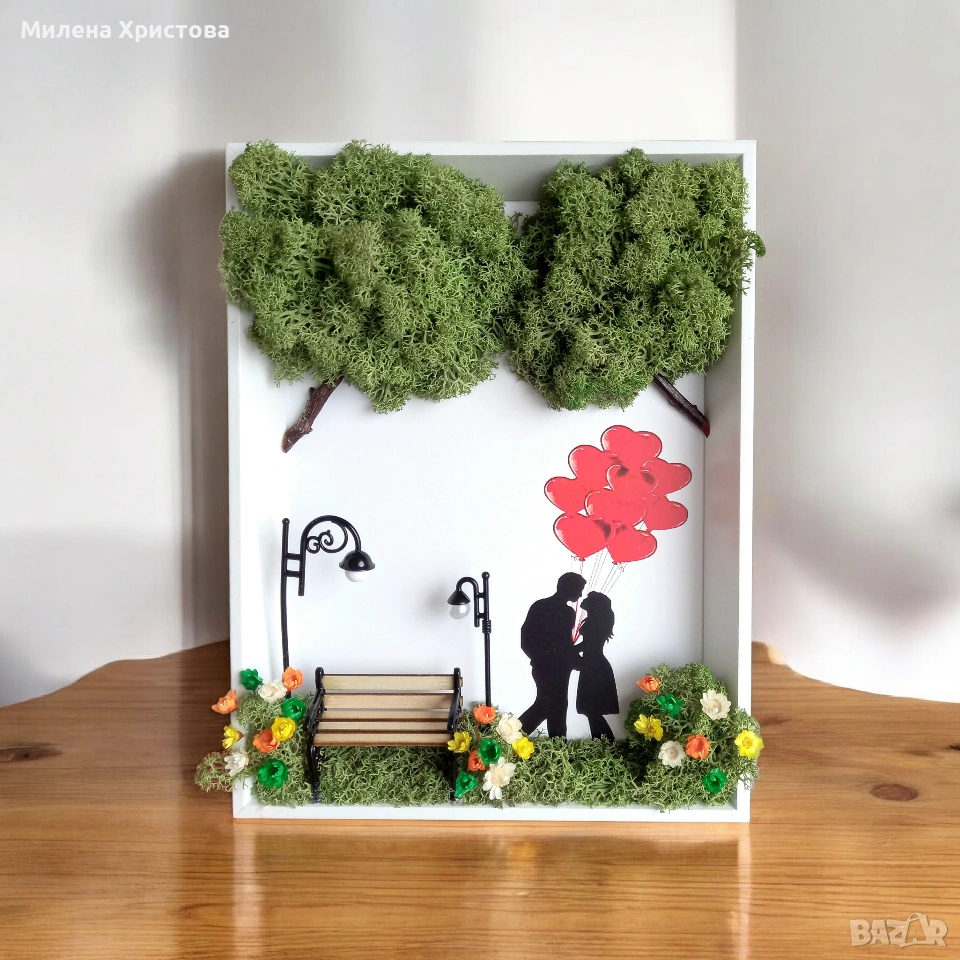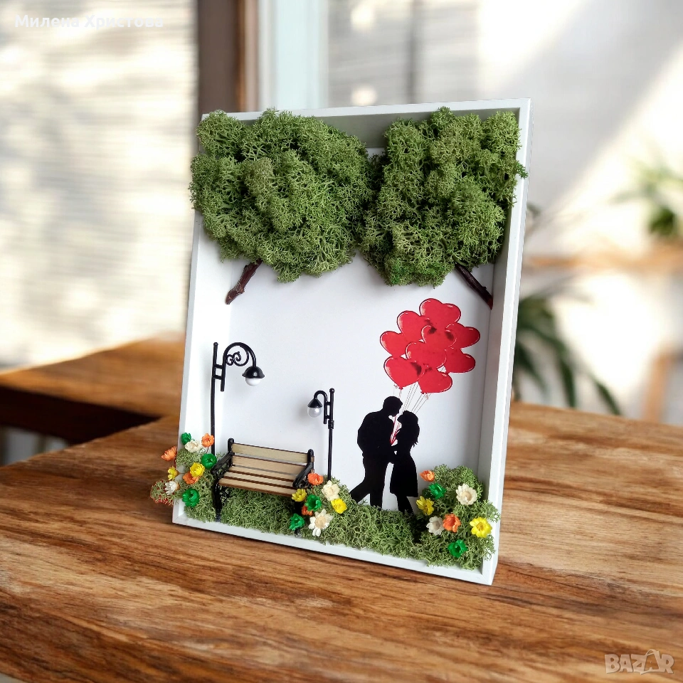 💖✨ Любов, уловена в картина… ✨💖 🎁💝 Перфектният подарък за Свети Валентин, който говори вместо думи и остава завинаги. 🌿 Ръчно изработени картини със скандинавски мъх, стабилизирани цветя и клонки, носещи романтика и уют. 🏡 Композициите са малък свят с истински умалени фигурки – фенери, пейка и колела, които разказват нежна любовна история. 💌 Различен и емоционален подарък, който не увяхва, както истинската любов. ✍️ Персонализация по желание: ❤️ Надпис ❤️ Имена на двойката ❤️ Специално послание 🎁 Подходящи за Свети Валентин, годишнина, годеж или друг специален повод. Размери 22/17 см.
