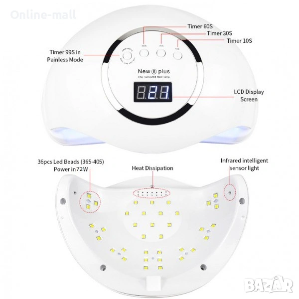 Интелигентен термо контрол (Over-Temperature Design): Лампата автоматично следи вътрешната си температура. При прегряване тя преминава в режим на ниска мощност, докато се охлади, което предпазва както уреда, така и вашите нокти.