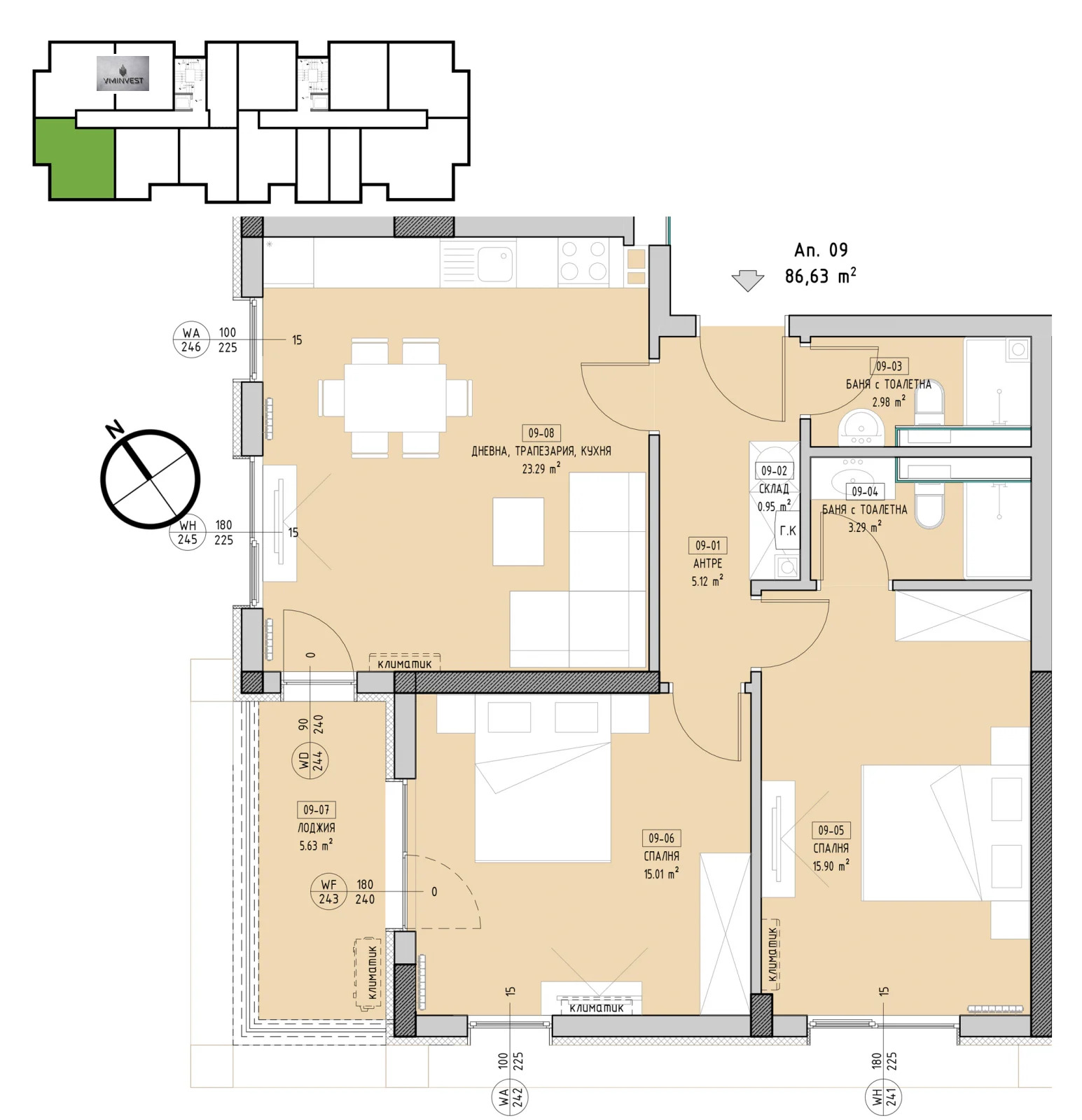Разпределение: входно антре /5,12 кв.м./, дневна с кухненски бокс /23,29 кв.м./, спалня /15,01 кв.м./, втора спалня /15,90 кв.м./, склад /0,95 кв.м./, баня тоалетна /3,29 кв.м./, втора баня с тоалетна /2,98 кв.м./, и лоджия /5,63 кв.м./.