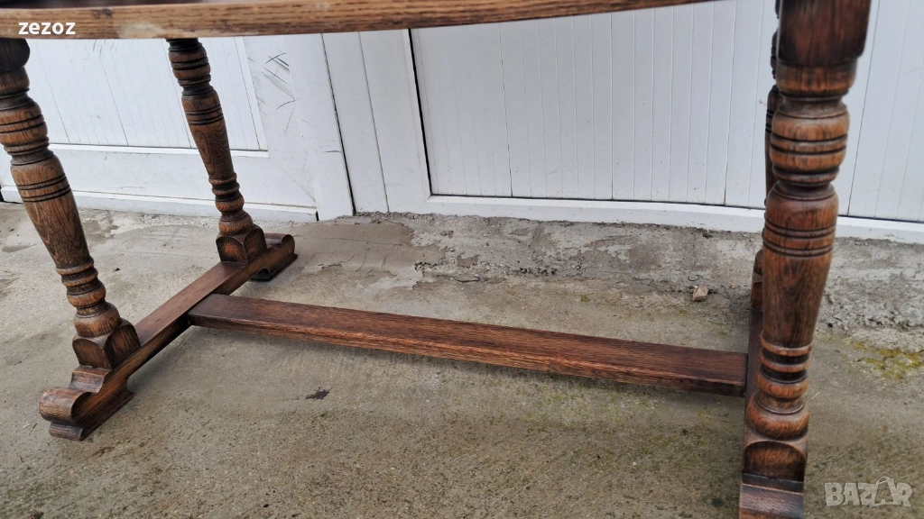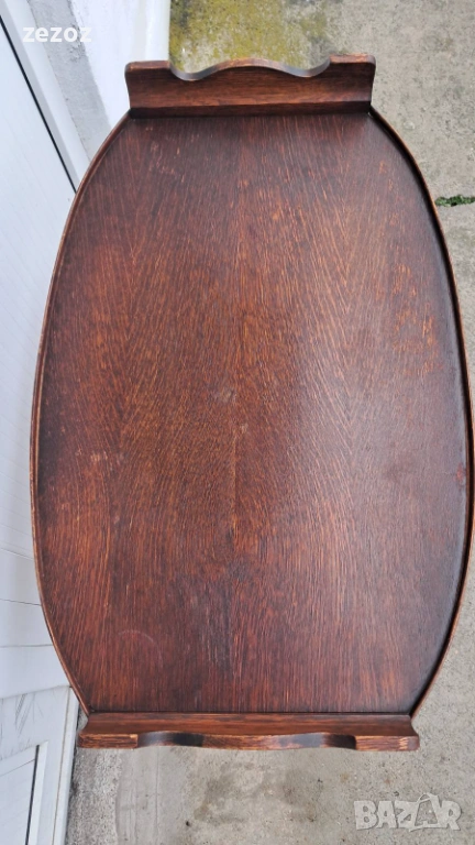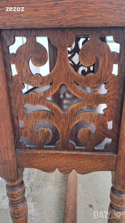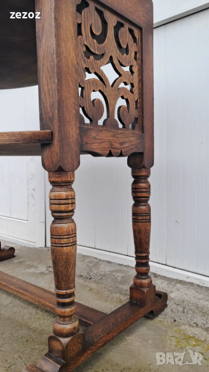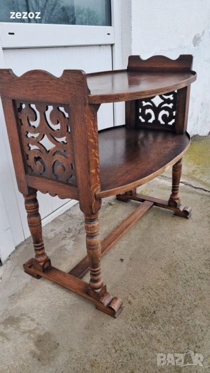 Красива помощна маса,изработена от дъбов масив.Ажурна дърворезба по страничните панели.Много подходяща за алкохол и чаши.Конструктивно здрава и запазена.Размери-