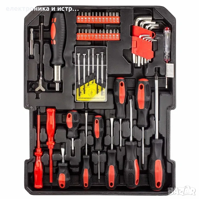 Сред инструментите ще откриете отвертки, френски ключове, клещи, макетни ножове, шестограни и много други, разпределени на четири нива, както следва:
