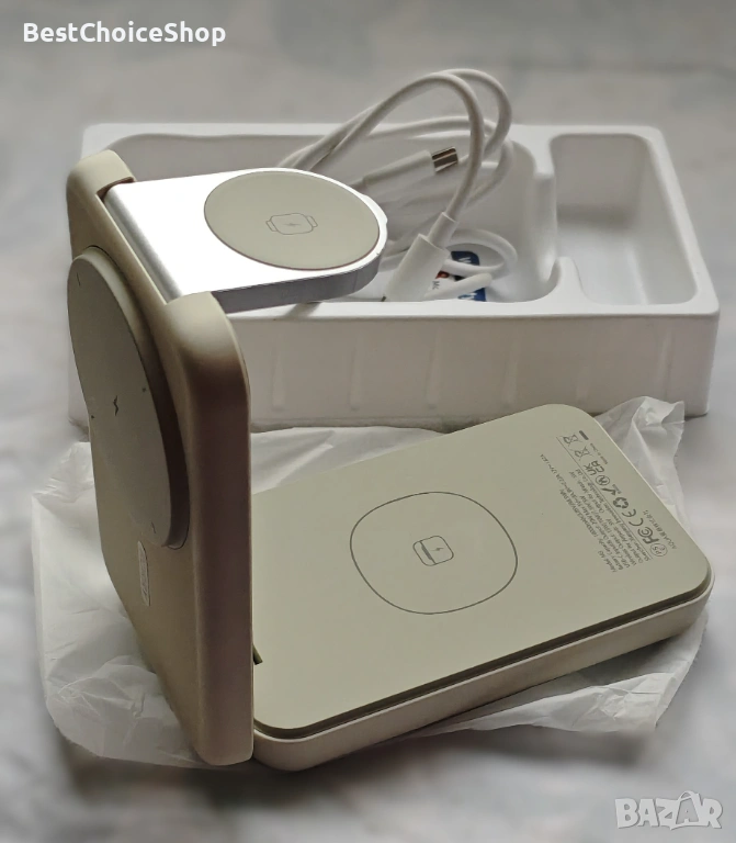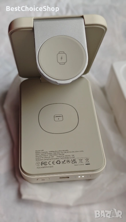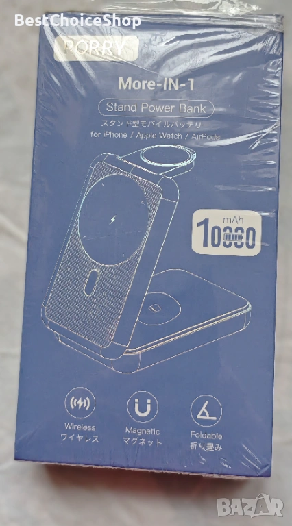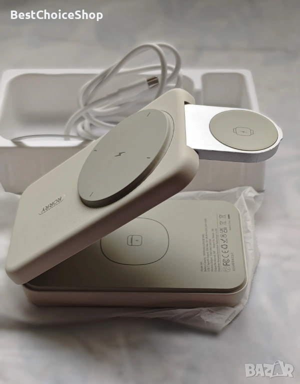 Това е RORRY 3-в-1 безжична зарядна станция и преносима външна батерия с капацитет 10 000 mAh. Може да зарежда едновременно iPhone, Apple Watch и AirPods. Устройството има батерия с капацитет 10 000 mAh, което го прави подходящо за пътуване. Функционира както като зарядна станция, така и като преносима външна батерия. Поддържа бързо зареждане на съвместими устройства.