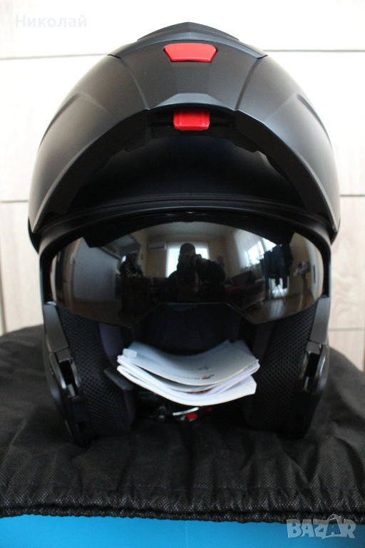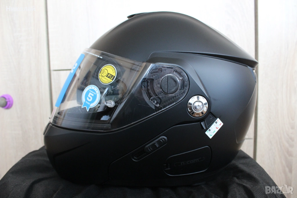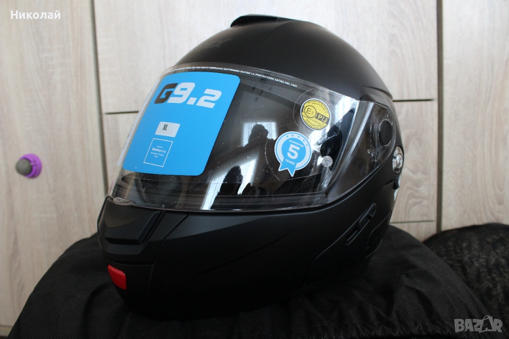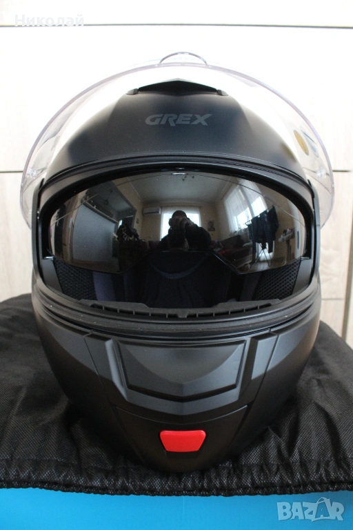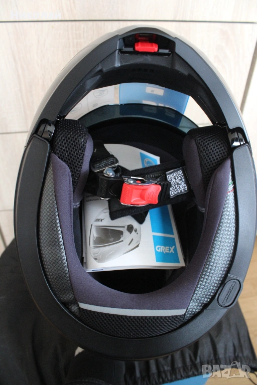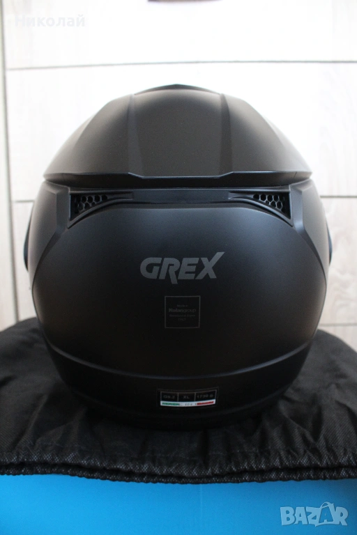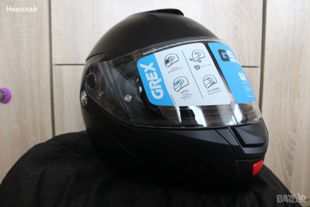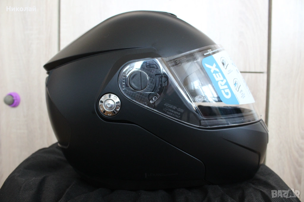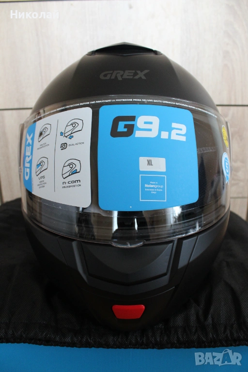 Чисто нова каска Grex G9.2, размер "XL". Марката Grex е част от Nolan Group, каски проектирани и произведени в Италия с гаранция за качество и сигурност. Моделът G9.2 е модуларна каска с вградени слънчеви очила, които също както и визьора са с покритие против надраскване, против изпотяване, както и UV защита от слънчевите лъжи. Визьорът е и с пинчета за поставяне на Pinlock. Каската е подготвена за поставяне на фабричният интерком на Nolan като разбира се може да се поставят и други марки. Сертификат за сигурност ECE 22.05, като има и допълнителна хомологация за ползване на каската с отворена челюст, както и механизъм, който я заключва в отворена позиция и предотвратява нежелано затваряне при рязки движения.