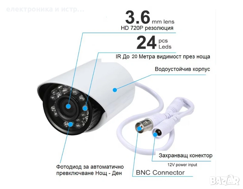 ЗА КАМЕРИТЕ: Вграден 3.6мм обектив ,с резолюция на снимане 1mpx - 720P и 24 инфрачервени диоди, които при работа в нощен режим ви позволяват да покриете 20 метрова дистанция. В комплекта е включен и 4 канален FULL HD видеорекордер с Възможност за отдалечено видеонаблюдение през смартфон с приложение. Опция за добавяне на микрофон. Управление през графично меню посредством мишка включена в комплекта.