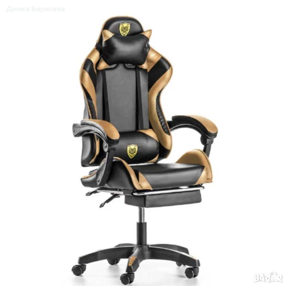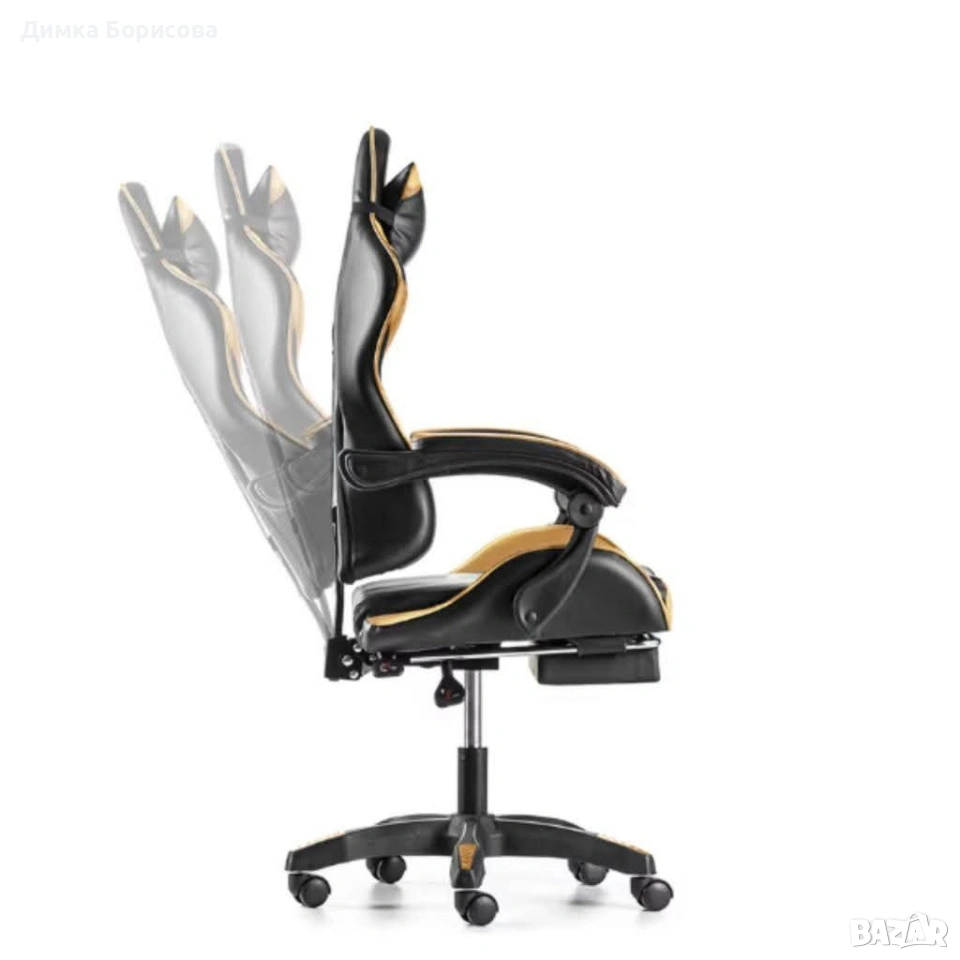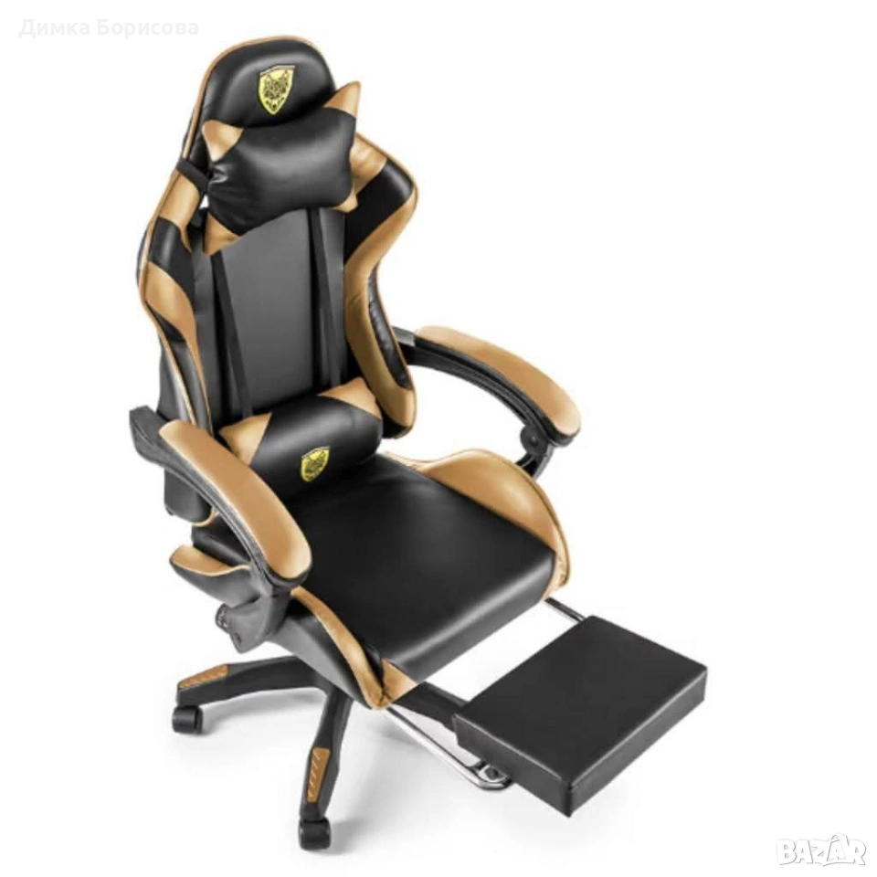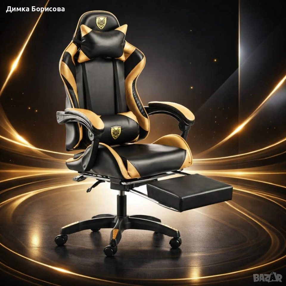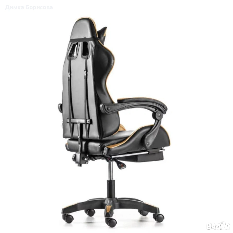 Черен геймърски стол с златисти акценти и разтегляема поставка за крака → Обява 53244553