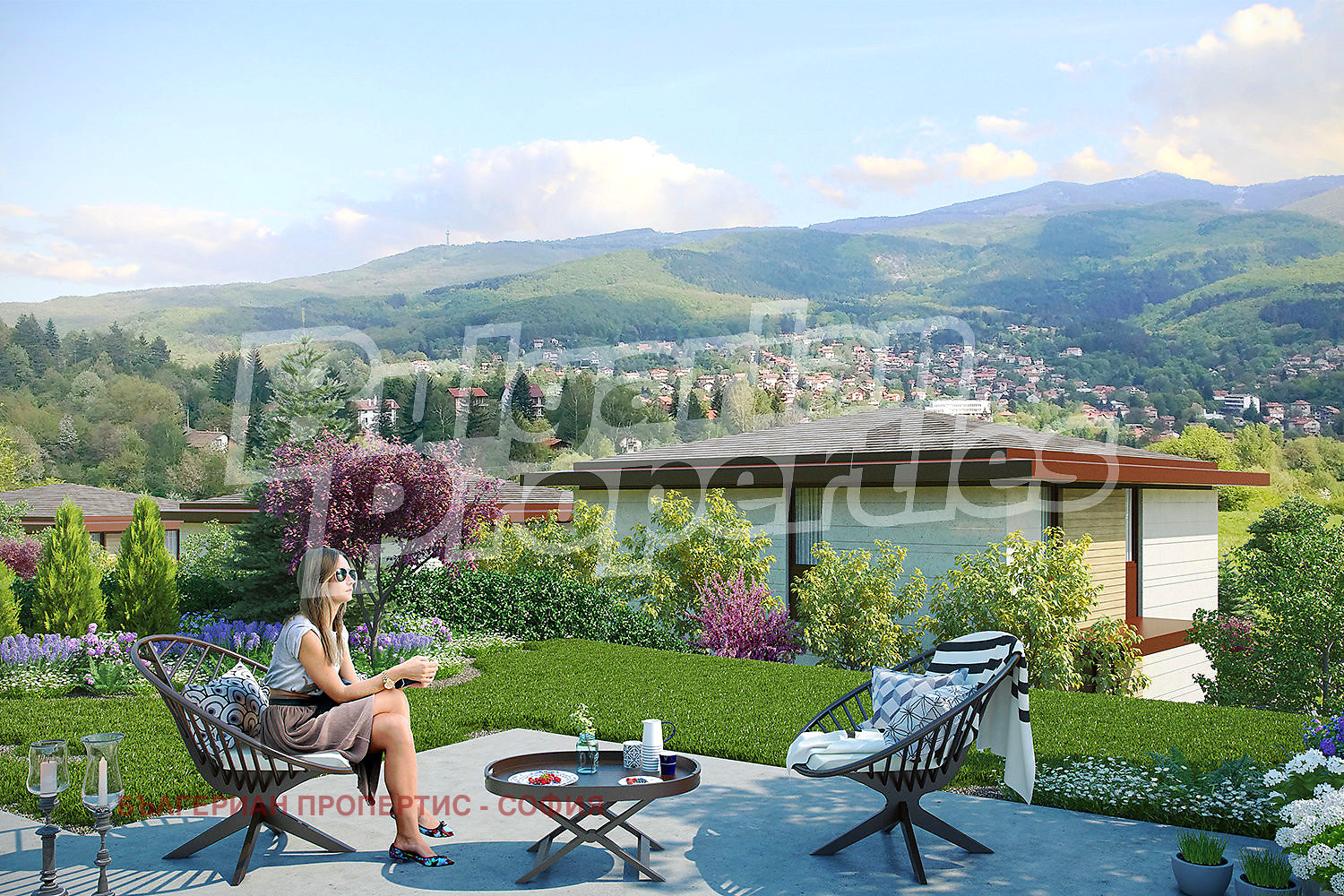 Максимално остъклените фасадни стени на жилищните помещения и просторните зелени дворове, явяващи се естествено продължение на интериорните пространства, са изцяло подчинени на концепцията за функционална и спокойна жилищна среда, която естествено и непринудено функционира в единство с природата! Къщите са разгърнати ветрилообразно, всяка една с изложение на всички жилищни помещения изцяло насочени и отворени към панорамата на Витоша. Във функционално отношение къщите са сходни с малки различия по отношение на терена и реда, на който са разположени.