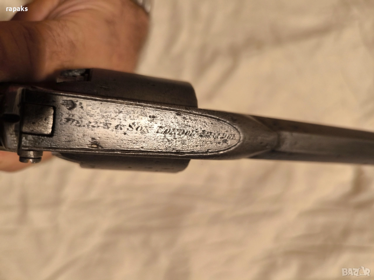 Колекционерски много рядък английски перкусионен еволвер Отлично техническо състовние. Сингъл и дабъл екшън. Всичко гнезда на барабана са Проводима и пистоните не са под бити. Колекционерски модел *пистолет. Работи чудесно. Старинно колекционерско оръжие подходящо за възстановки, декорация, колекция и украса. Без нужда от разрешителни, защото е освободен от отчет от закона Подарък 5 броя буфери за сигнални патрони 9 мм. С тях веселбата ще може да е пълна и да се участва във възстановки. Продавам и други оръжия на свободен режим, за това разгледайте обявите ми и се наслаждавайте.