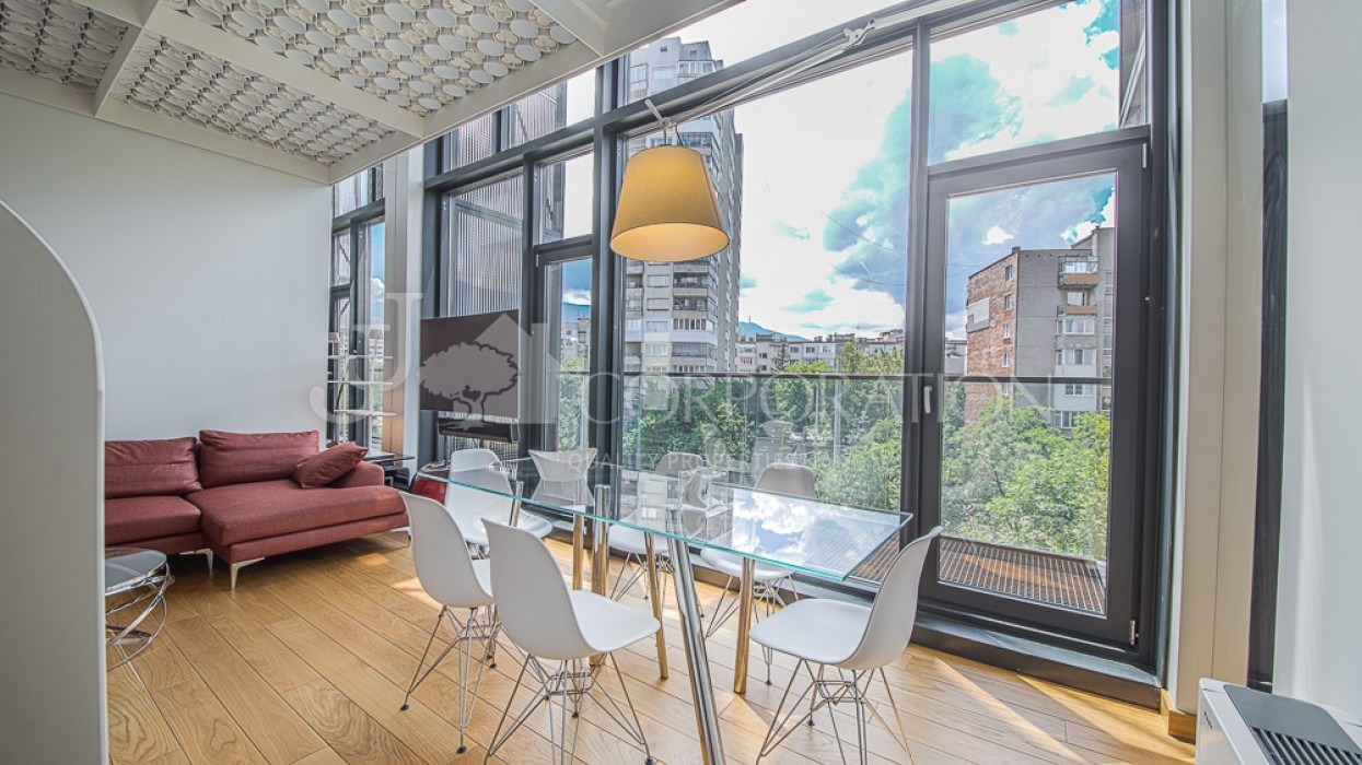 ЕМБЛЕМАТИЧНА СГРАДА! НА ВХОДА НА ЮЖЕН ПАРК! НАПЪЛНО ОБЗАВЕДЕН ПО ДИЗАЙНЕРСКИ ПРОЕКТ! Предлагаме на Вашето внимание луксозен мезонет, находящ се в кв. Иван Вазов. Апартаментът се намира на четвърти етаж в единствена по рода си сграда със собствен характер и уникална архитектура. Жилището се състои от входно антре, дневна с кухненски бокс и трапезария, голяма тераса, вита стълба, водеща към кабинет, три непреходни спални (родителска спалня с дрешник, баня с тоалетна и балкон към нея, детска стая с балкон към нея, стая за гости, баня с тоалетна. Изложението е юг/запад, като две от спалните гледат на юг, а дневната, една спалня и кабинетът на запад. Всички мебели са поръчкови. Апартаментът разполага с немски осветителни тела Vibia, OLED Smart телевизори, пералня, сушилня (всички ел. уреди са на Miele), кабелна, интернет... Отоплението и охлаждането е посредством чилърна система. С паркомясто включено в наемната цена. Удобно е да се обаждате по всяко време! Работим с колеги по всички наши оферти! Водещ брокер Ирина Джанева 0887 219 224. Оферта номер:0503.