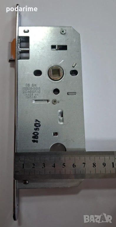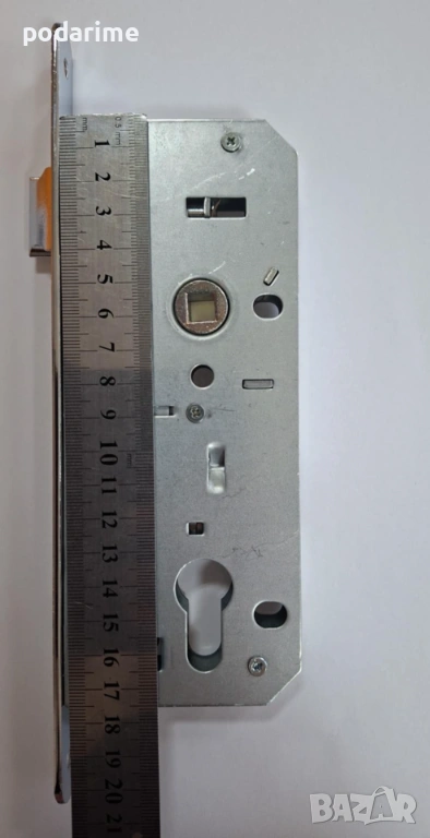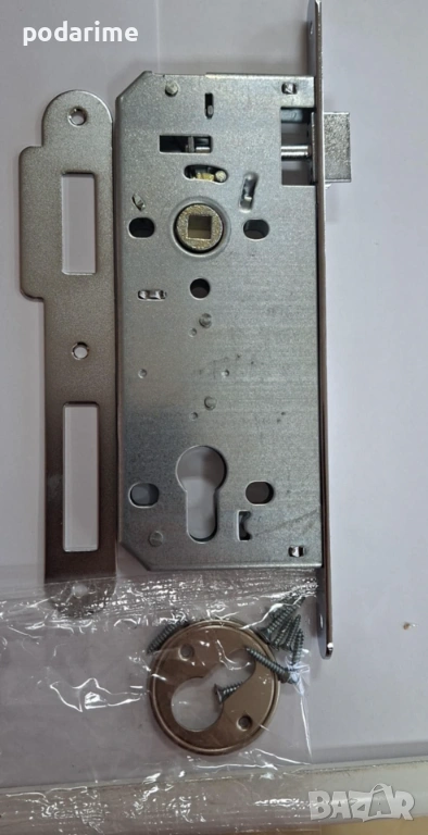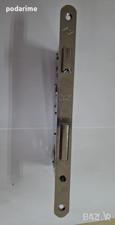 Брава Кале 252 RP, междуцентрие 85 мм и бексет 45 мм, секретна, ДИН. Челна планка, тясна - 18 мм, широчина,дължина 240 мм, беждуболтово разстояние 204 мм. Реверсивен горен език - без разглобяване!Налични проходни отвори за проходни болтове на горни розетки и бронировка. Комплекта включва: брава, насрещнки, розетка и крепежи. Бравата се предлага без патрон и дръжки!