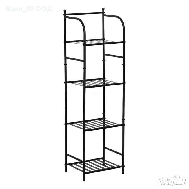 Практичен и стилен метален рафт с 4 нива, подходящ за съхранение на цветя, хавлии, декорации и други малки предмети. Изработен от здрав метал в черен цвят. Идеален за балкон, тераса или вътрешно пространство.
