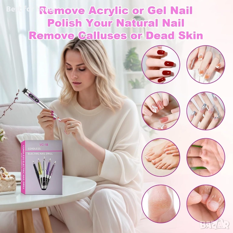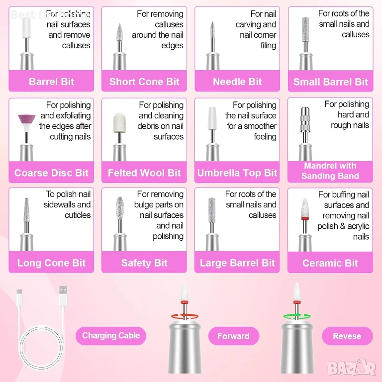 【Пълен комплект за свредла за нокти】Вашето решение „всичко в едно“ включва: 12 професионални свредла, 36 шлифовъчни ленти с различни зърнености, хигиенична четка за почистване, първокласен калъф за съхранение, USB-C кабел за зареждане. Идеален за рафиниране на кожички, премахване на акрил, третиране на твърда кожа и сложни нокти – еднакво ефективен за ръце и крака.