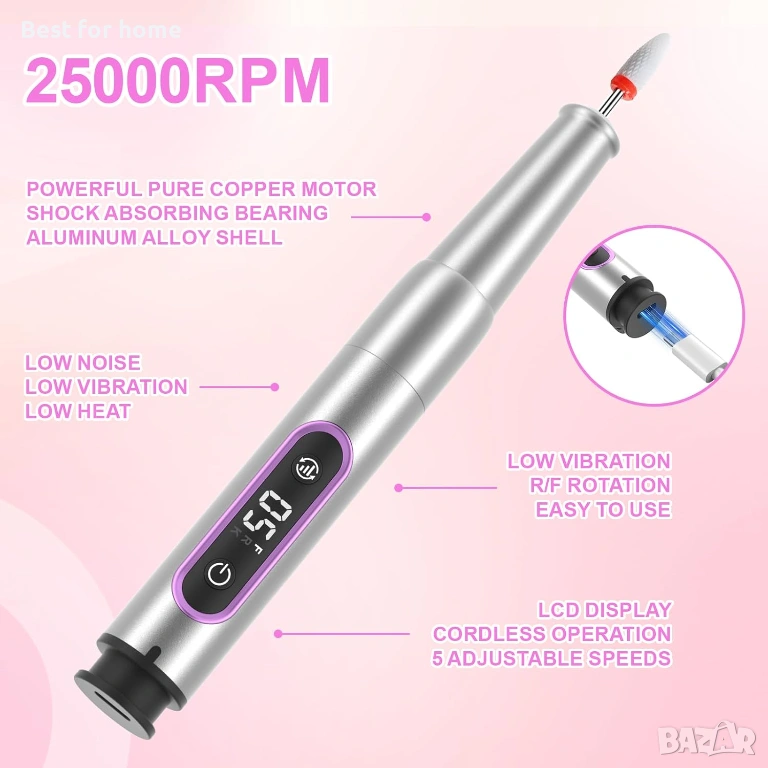 【Интелигентно персонализиране на скоростта】Електрическата пила за нокти обработва всеки детайл с 5 регулируеми скорости (5000-25 000 об/мин) за деликатно пилене или интензивна работа с акрил. Иновативната двупосочна функция (двойно натискане на бутона за захранване за обръщане) е подходяща за всички потребители, с ергономичност за безпроблемна употреба с лява и дясна ръка.