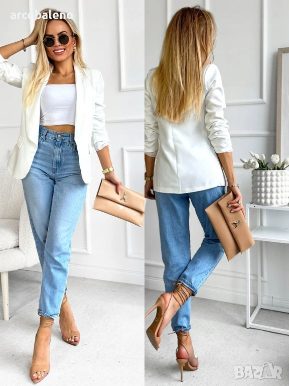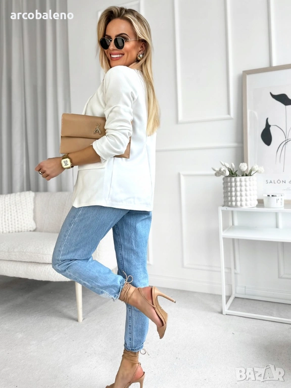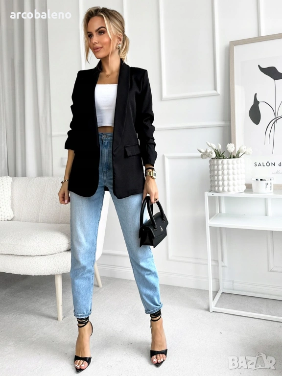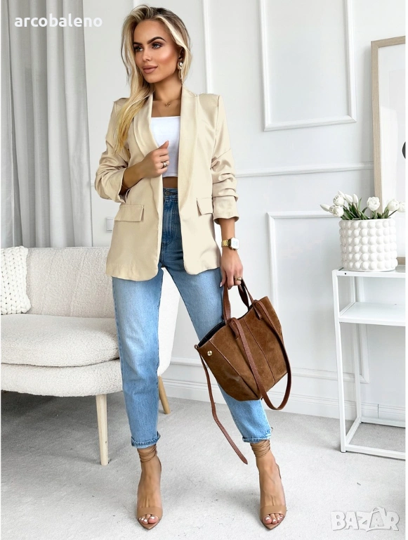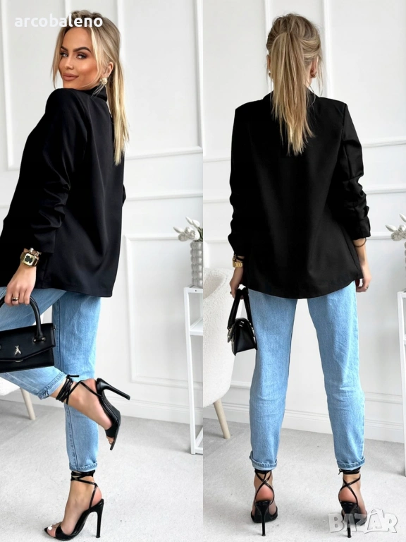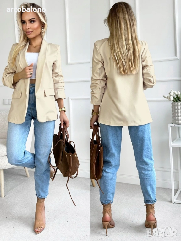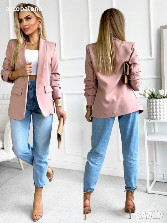Елегантно дамско сако с драпирани ръкави, модерно и стилно.