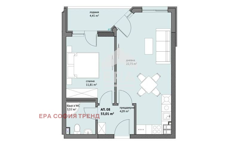Апартаментът е с обща площ 64.59 кв.м. и ЗП 55.01 кв..м., разпределение: предверие /4.09 кв.м./, дневна с трапезария и кухненски бокс /22.73 кв.м./, спалня /11.81 кв.м./, баня с тоалетна /3.55 кв.м./ и лоджия /4.45 кв.м/., към продажната цена е включено и складово помещение / 1,77 кв.м/.