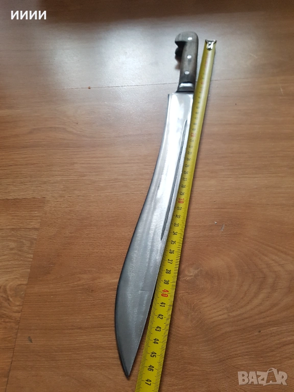 Изкован от ресорна стомана, закален и шлайфан. Дървена дръжка от бряст с железни нитове. Обща дължина 46-47 см.