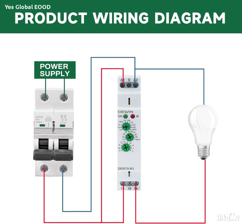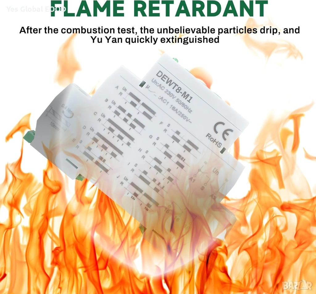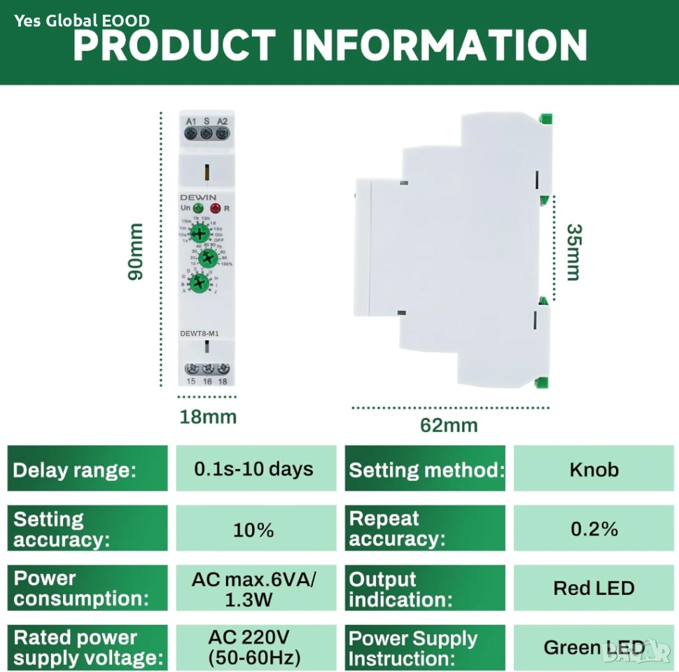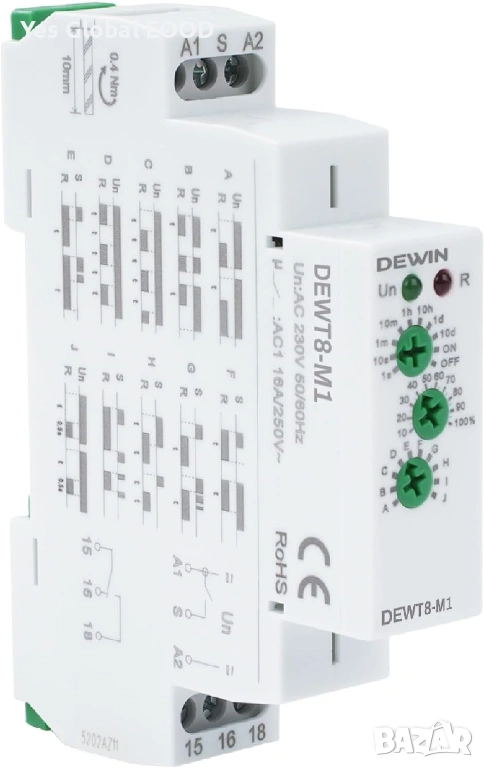 DEWIN DEWT8-M1 е многофункционално времереле, предназначено за управление на електрически вериги с времезакъснение. Работи на AC 230 V и се монтира лесно на DIN шина. Релето разполага с 10 различни режима на работа, което го прави подходящо за автоматизация в електрически табла, осветителни системи, индустриални и битови приложения.