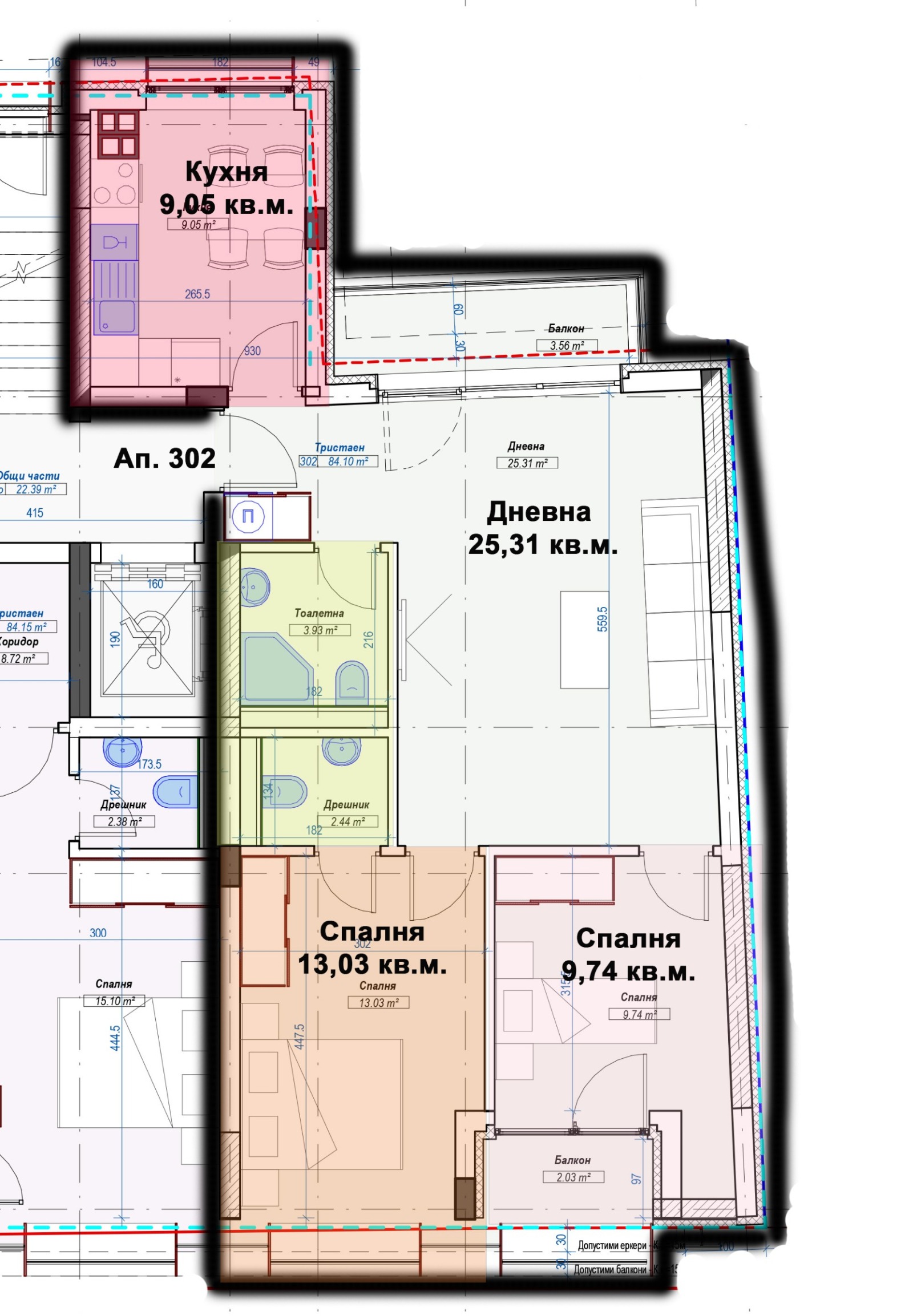 находящ се на 7-ми жилищен етаж - АПАРТАМЕНТ 302 от чертежите - ЗП - 84 кв.м.; ОЗП - 106,67 кв.м.