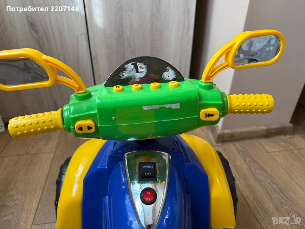 Детска кола с педал за задвижване, има бутон за ход напред и назад. Навън не използвана само вътре. Със зарядно за батерията.