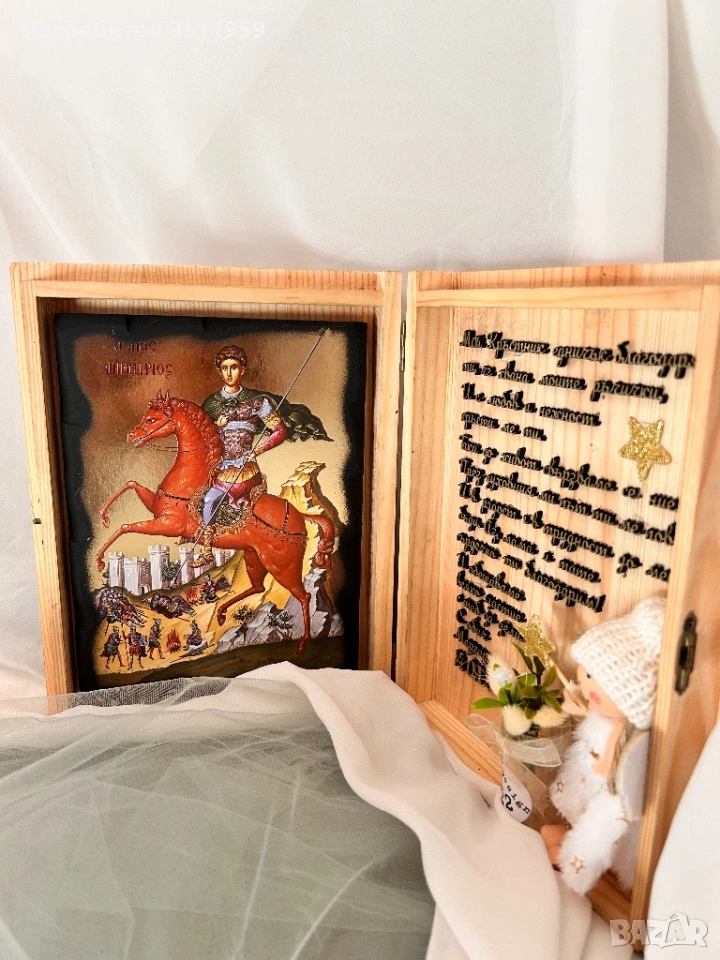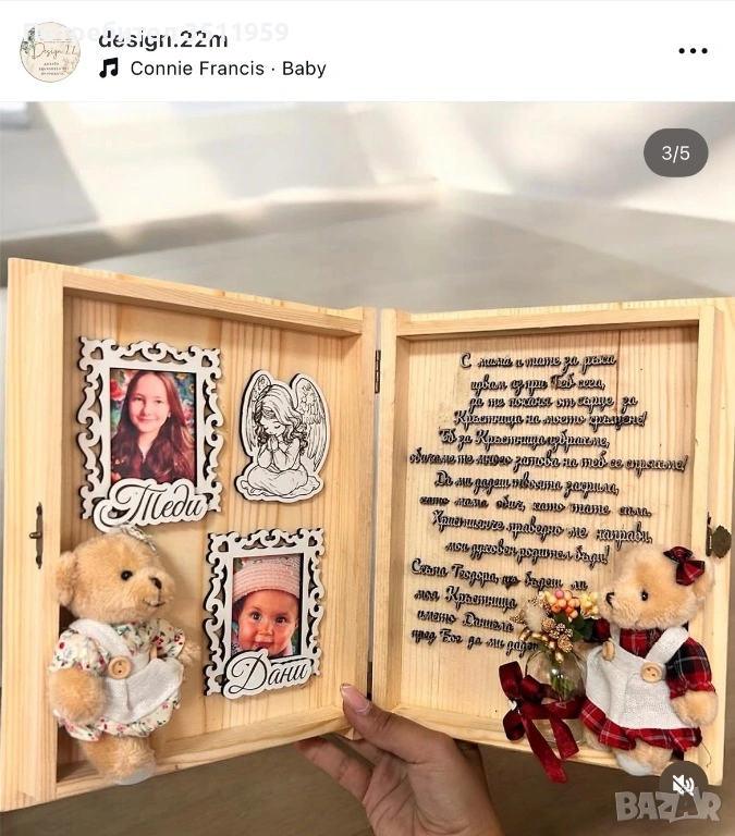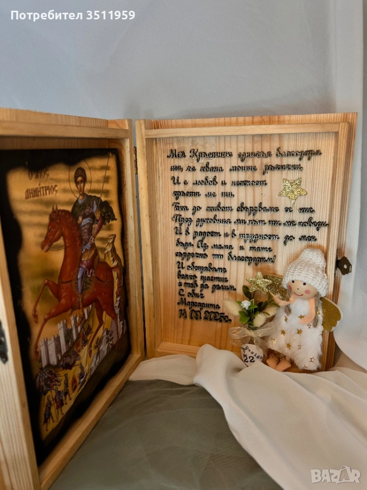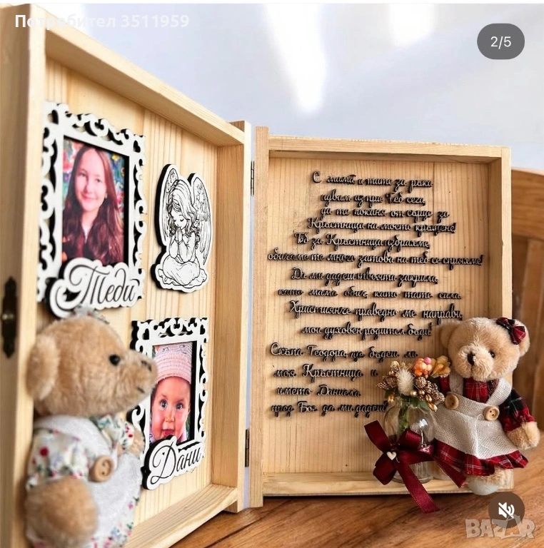 Тази дървена кутия-книга е създадена с много обич – в нея съчетахме икона за благословия, малко букетче за нежност и фея кръстница – символ на закрилата и добротата.