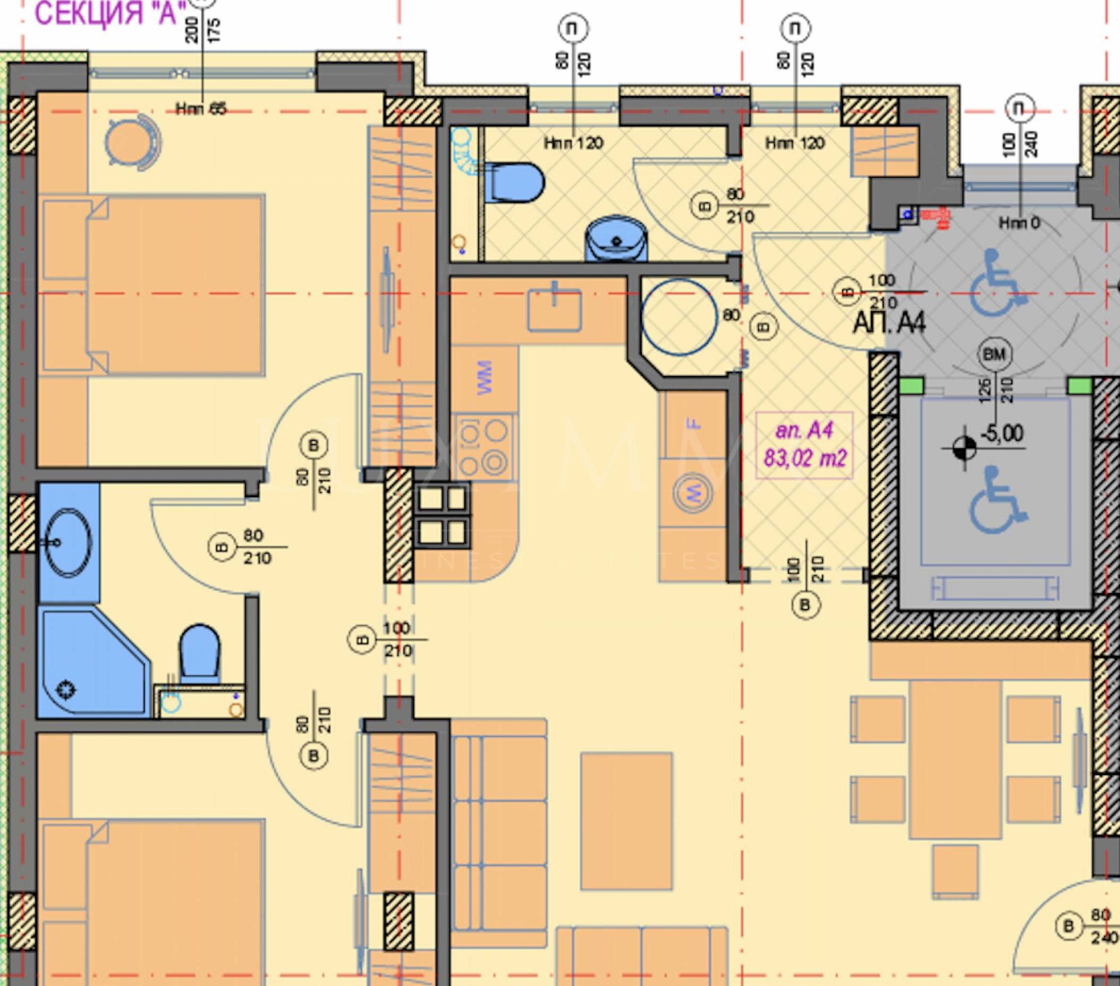 Апартаментът се отличава с просторна дневна зона, функционално отделена нощна част с две самостоятелни спални, две санитарни помещения, склад и два балкона, осигуряващи отлична осветеност и комфортно обитаване. Разпределението е подходящо както за семейно жилище, така и за дългосрочна инвестиция.