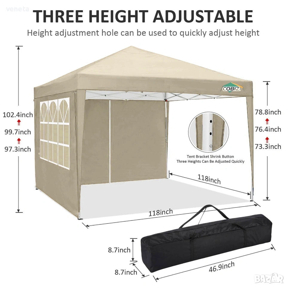 Подробности за продуктаИзскачащият сенник COBIZI 10x10 е изработен от здрава стоманена рамка и прахово боядисан, устойчив на ръжда, корозия, начупване и лющене. 210D оксфордската тъкан със сребърно покритие може да издържи на водоустойчиво налягане до 1000Pa, водоустойчива, анти-UV. 4 странични стени включват 2 ципа и 2 прозореца, можете да поставите всички странични стени или едно парче, само сами. Предлагаме да не поставяте палатката с балдахин при силен вятър или сурово време.Ключови характеристикиНОВ ДИЗАЙН, НОВ ЦВЯТ: За по-добра вентилация и охлаждане, COBIZI Pop-up Canopy Tent има вентилационен отвор на покрива. Когато всички странични стени са поставени, свеж въздух може да потече в палатката през вентилационния отвор. Отвореният отвор отгоре също може да спре палатката да се повдига от вятъра. Отхвърляйки монотонността, добавени са три нови цвята - червен, зелен, сив цвят, които правят вашата палатка по-забележима.Подобрена издръжлива материя: горният сенник е изработен от 210D плат Oxford, който е 100% водоустойчив. UV сребърното покритие отразява 99% ултравиолетови лъчи. Това ще ви предпази при всякакви климатични условия.Надстроени настройки за 3 височини: Три различни настройки за височина ви позволяват да изберете височината, която отговаря на вашите нужди. Опции за височина на прав крак: Висока 6,6 фута, Средна 6,4 фута, Ниска 6,2 фута. Перфектен за търговски дейности на фермерски пазар, къмпинг, фестивали, празничен ден, семейни партита.4 СТРАНИЧНИ СТЕНИ + ПЯСЪЧНИ ЧУВАЛКИ: Търговският навес има 4 странични стени - 2 странични стени имат прозорци; 2 странични стени са с ципове. Тези странични стени са подвижни, можете да изберете да зададете или не за различна употреба. Instant Outdoor Canopy има допълнителни 4 чували с пясък за закрепване на палатката във ветровити и бурни дни. По-здрав!Анти-UV и водоустойчив: Покривът на търговския сенник е изработен от 210D Оксфорд плат с PU покритие. UPF 50+, блокира 99% от вредните слънчеви лъчи. Водното налягане на изскачащия навес е 1000pa, а силата на вятъра е 4-6.ЛЕСНО ЗА НАСТРОЙВАНЕ И СВАЛЯНЕ: Изскачащата палатка с беседка, с всички сглобени части, е лесна за поставяне и сваляне без никакви инструменти. Единият държи единия крак, докато другият дърпа друг крак, за да разтегне рамката. Откачане на цялото велкро за стена от краката, преди да влезе в сенника.