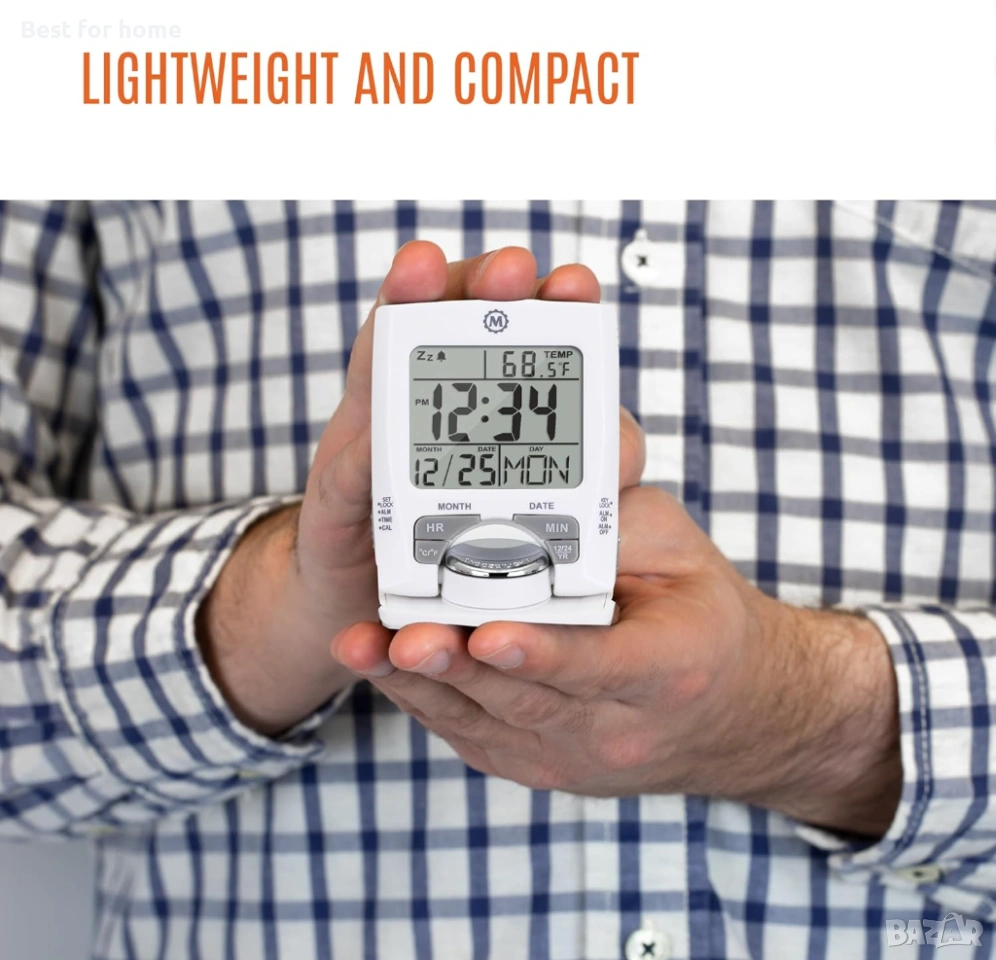 ВГРАДЕНА СТОЙКА: Сгъваем пътнически будилник с въртящ се на 180 градуса циферблат.