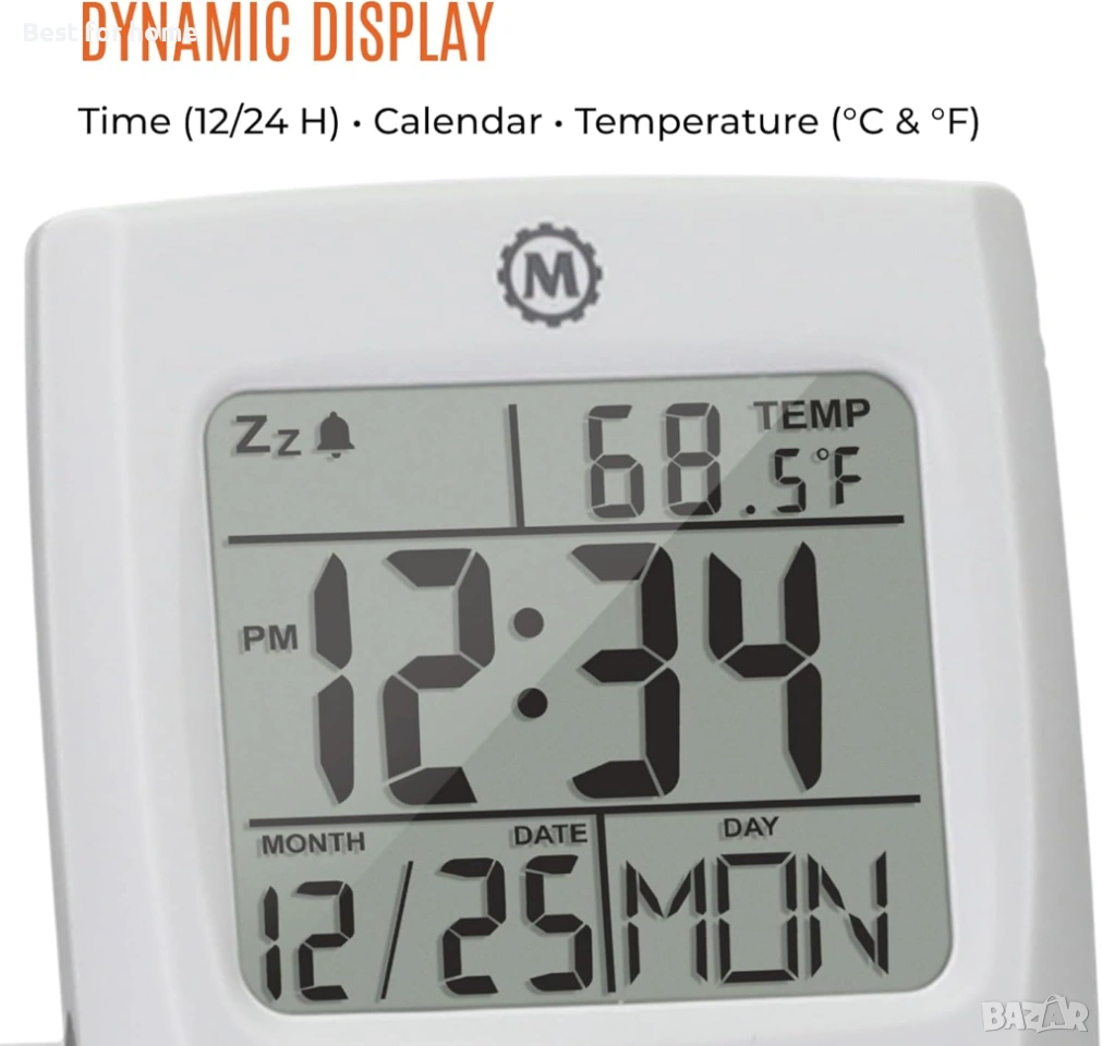 ТЕМПЕРАТУРА / КАЛЕНДАР: 12- или 24-часов формат на показване с показване на вътрешната температура в Целзий (°C) или Фаренхайт (°F). Показва месец, дата и ден.