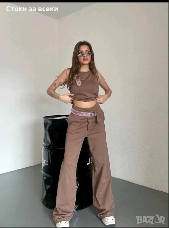 модерен дамски сет в черен цвята кафяв цвят – къс топ без ръкави и панталон с декоративен колан. Стои много елегантно и подчертава фигурата. Подходящ за ежедневно носене, излизане или парти.